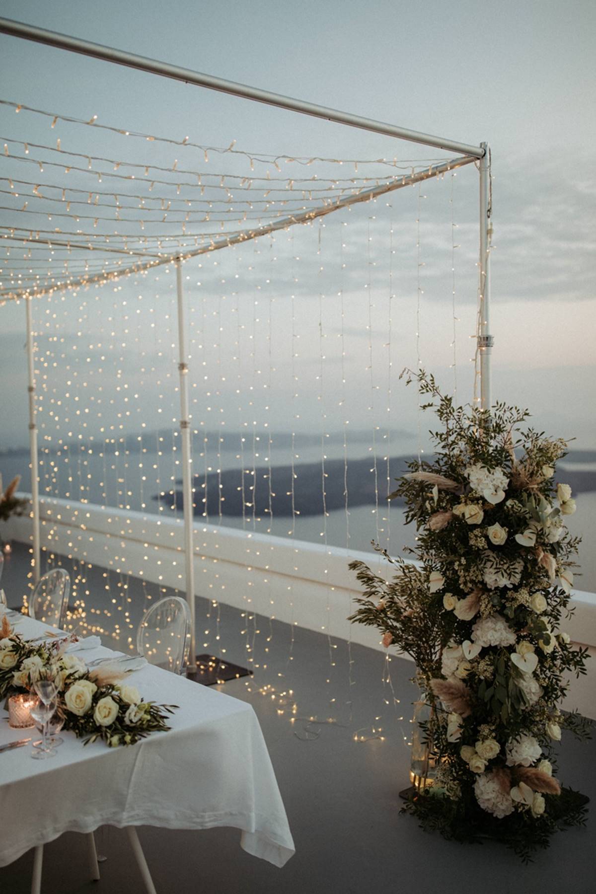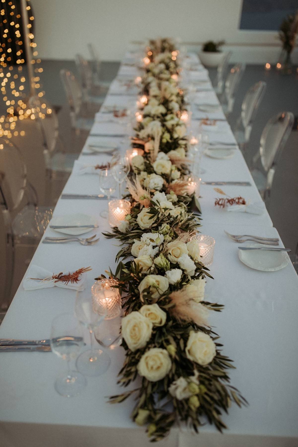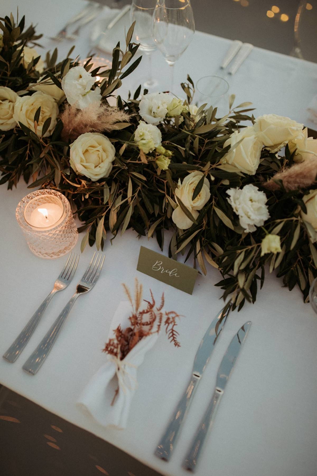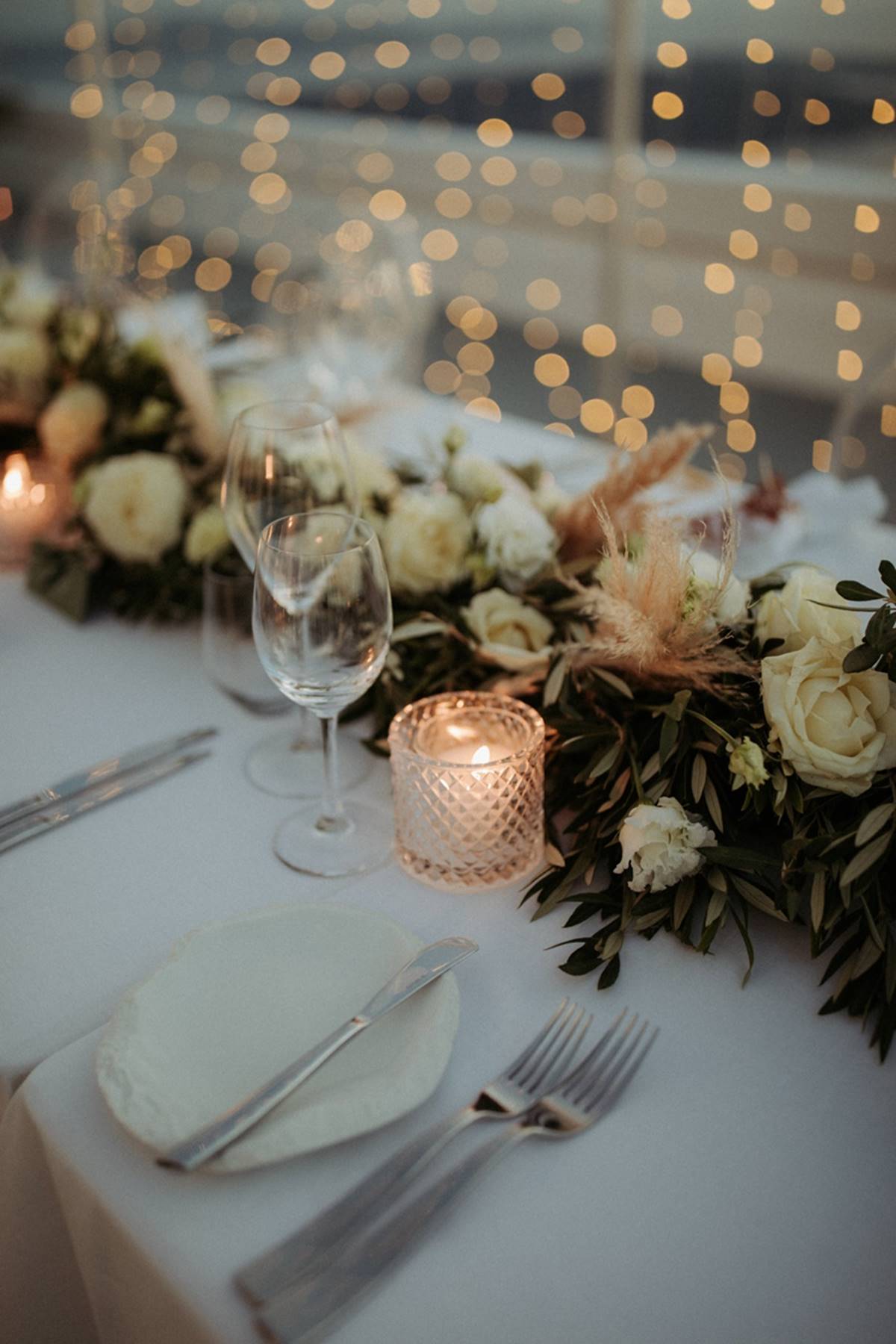 The décor reflected Ashley’s stunning sophisticated wedding dress and the couple’s sparkly personality. Our trusted associates Red Box Days helped us bring Ashley’s vision to life by using timeless olive branches combined with luscious white hydrangeas and roses and finished the arrangements with earthy pampas grass to give them special dimension. The setting could not have been complete without a bold touch of light and what better than a complete curtain of fairy lights that made guests and newlyweds think they were having the perfect dreamy dinner under a sky full of stars.