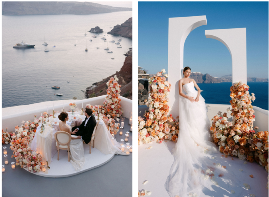 Intimate Santorini weddings, sunset ceremonies, elegant dinner-party receptions.