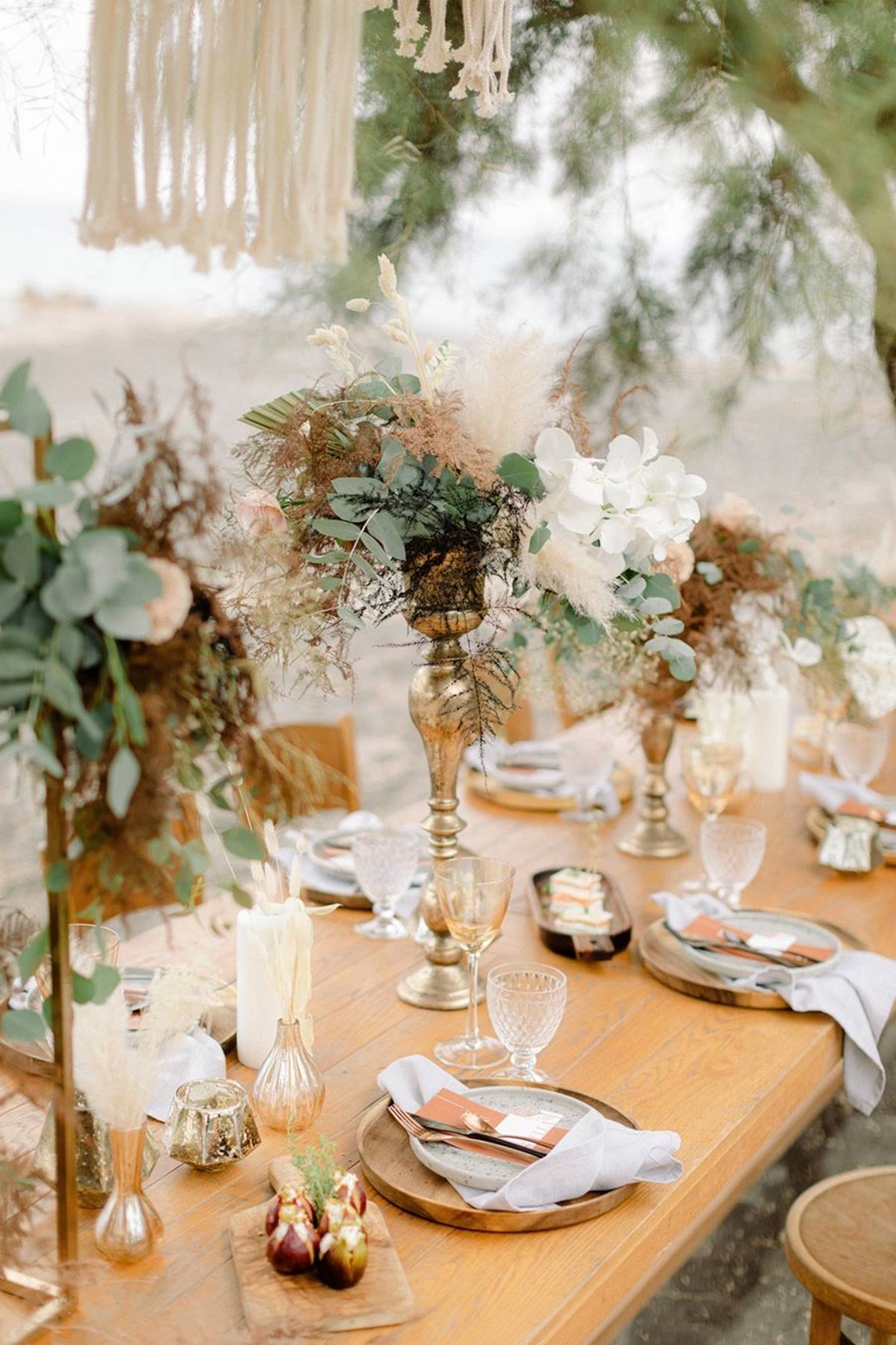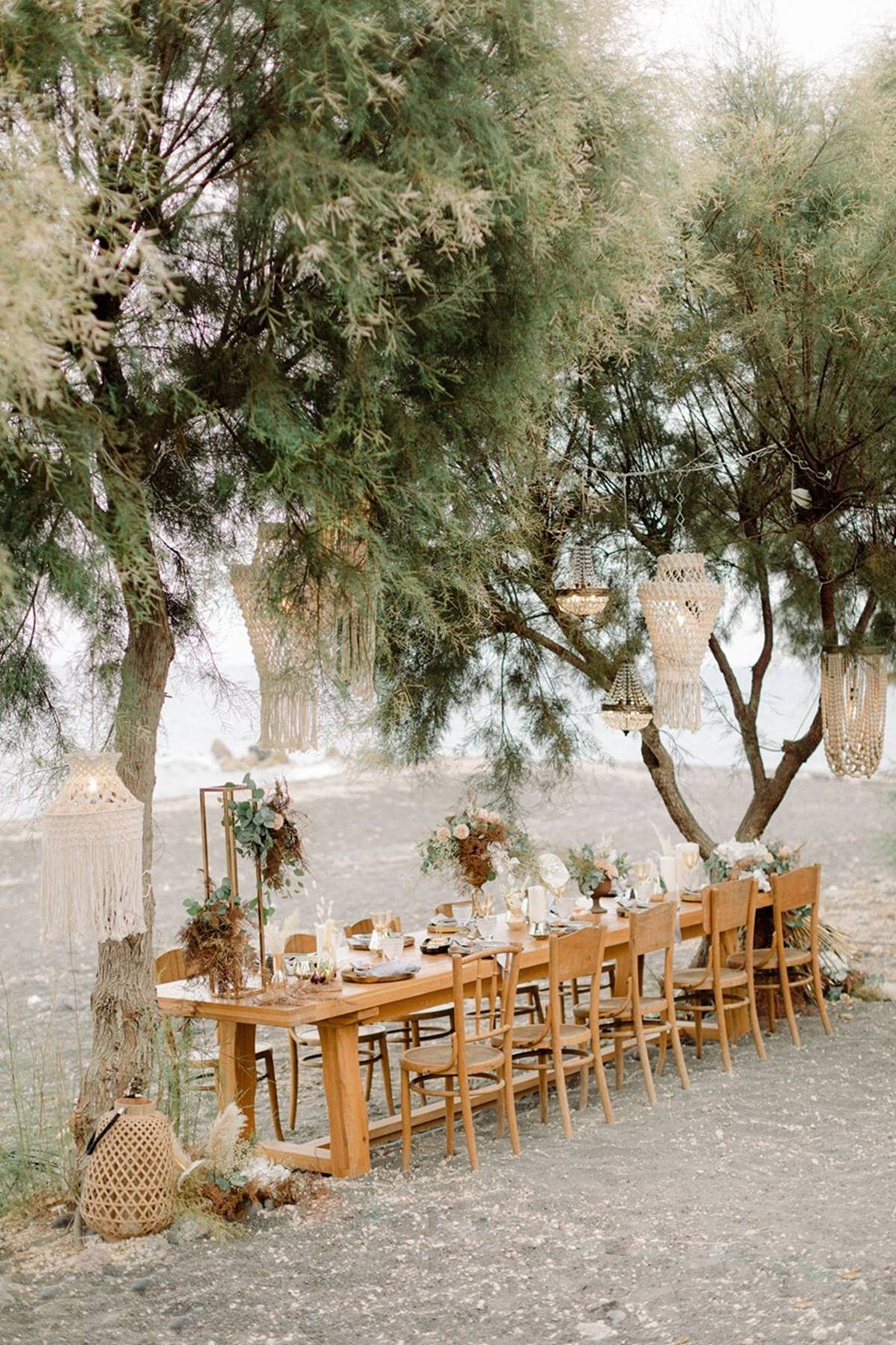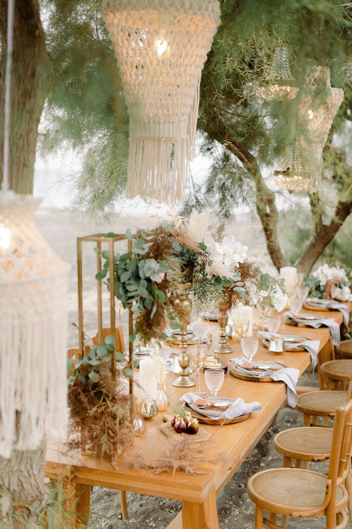The idea was to merge bohemian vibes with a modern attitude. Introducing earthy textures like stone, wood and fun ideas like macrame chandeliers, and marrying them with the elegance of the perfectly set up table (the perks of a small celebration), complete with luxe glassware, lush flower arrangements and high quality stationary. With a smaller guest list the flexibility in choosing a location and investing your budget leaves couples with endless possibilities.