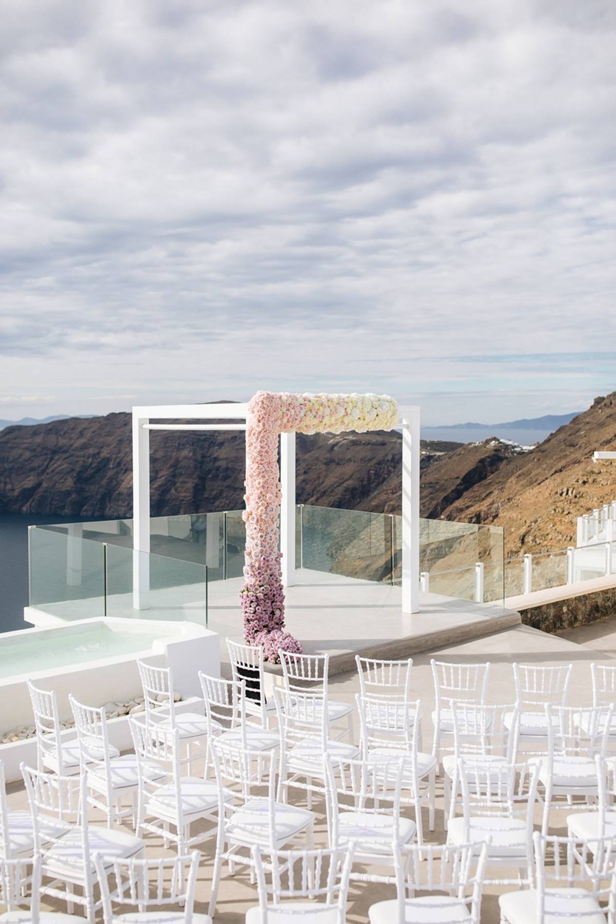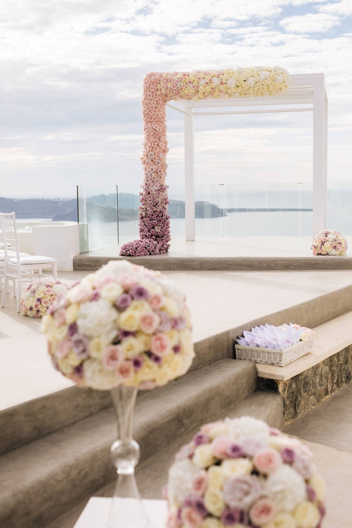 As the sun set behind the Santorini volcano, the guests enjoyed the reception décor and pink/lilac colours that filled Rocabella’s Infinity Pool terrace and Paul surprised Brittany in the most romantic way, with a live performance of Lady Gaga’s “Always Remember Us This Way”.