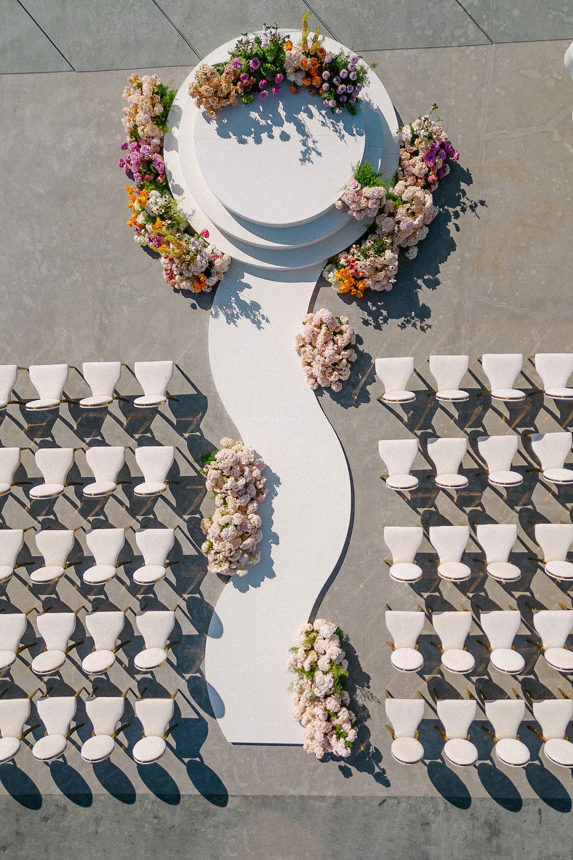 As their Greek wedding planner on the ground, we designed an event that reflected their story and vision while embracing the island’s romantic scenery. The ceremony featured a striking serpentine aisle surrounded by lush spring florals in pink, lilac, peach, and cream tones. Ivory and gold details added a touch of sophistication, as live piano and violin music accompanied the couple’s I Do’s.