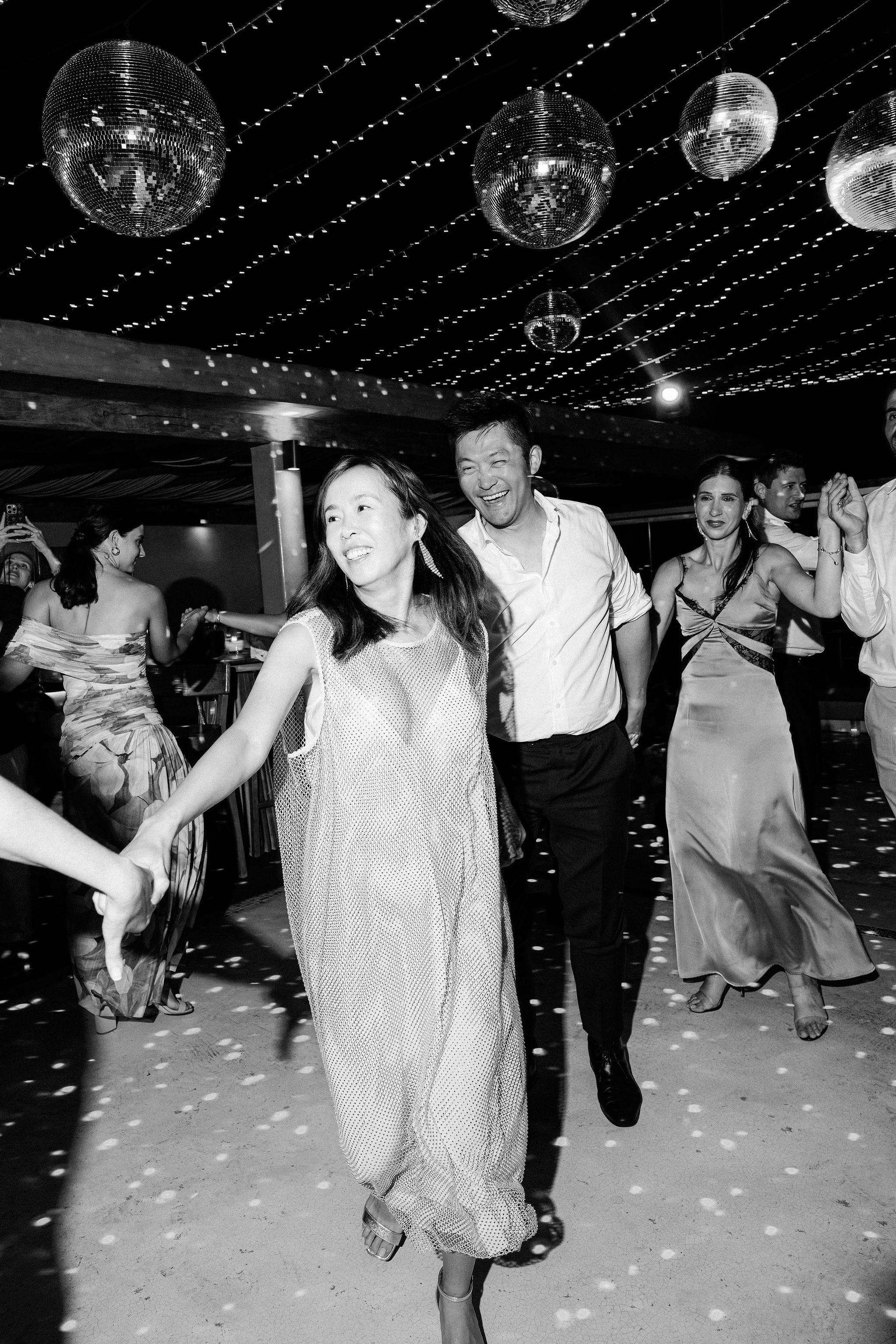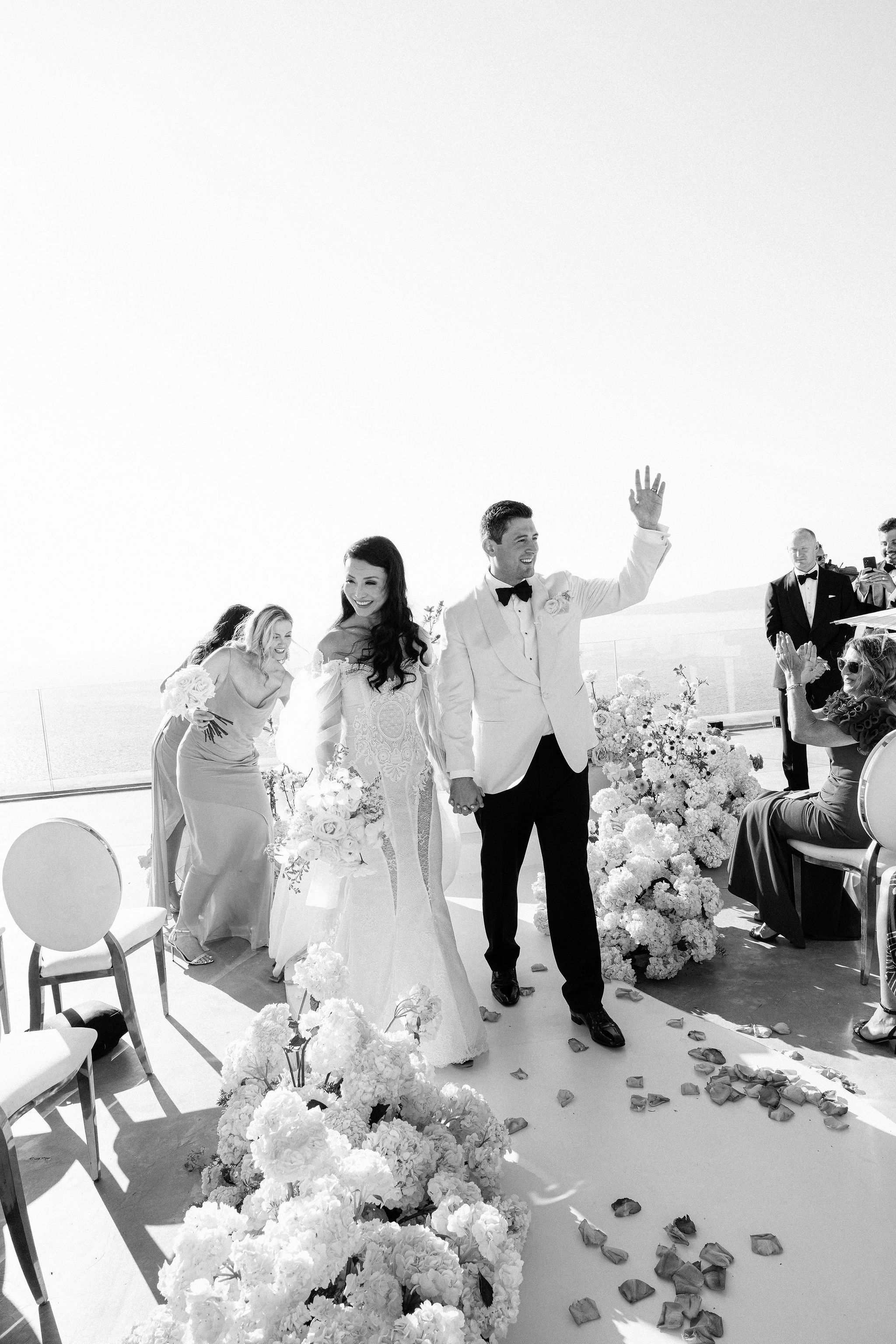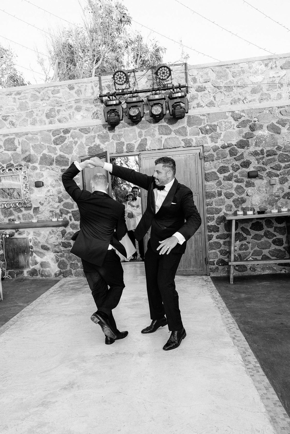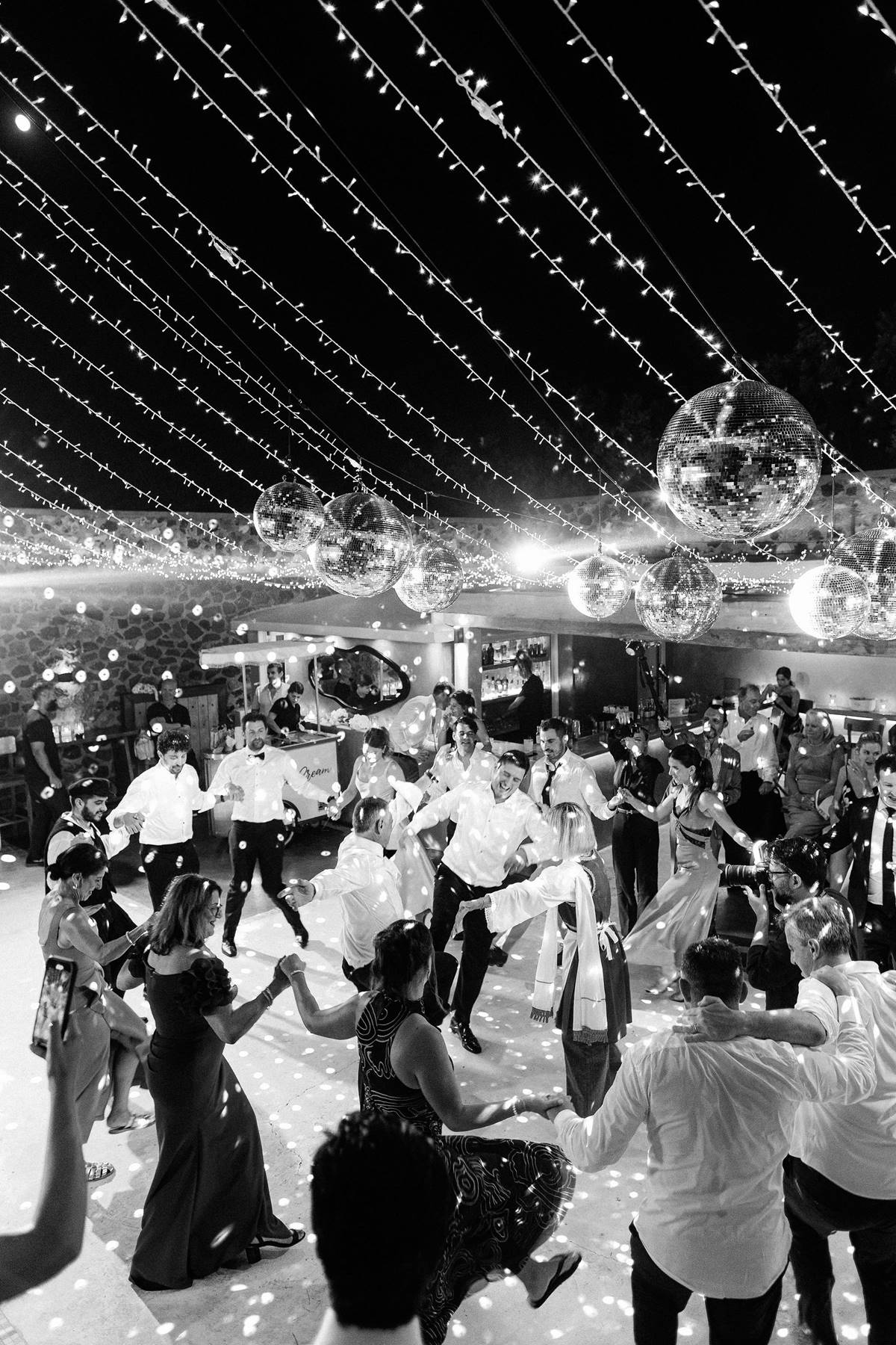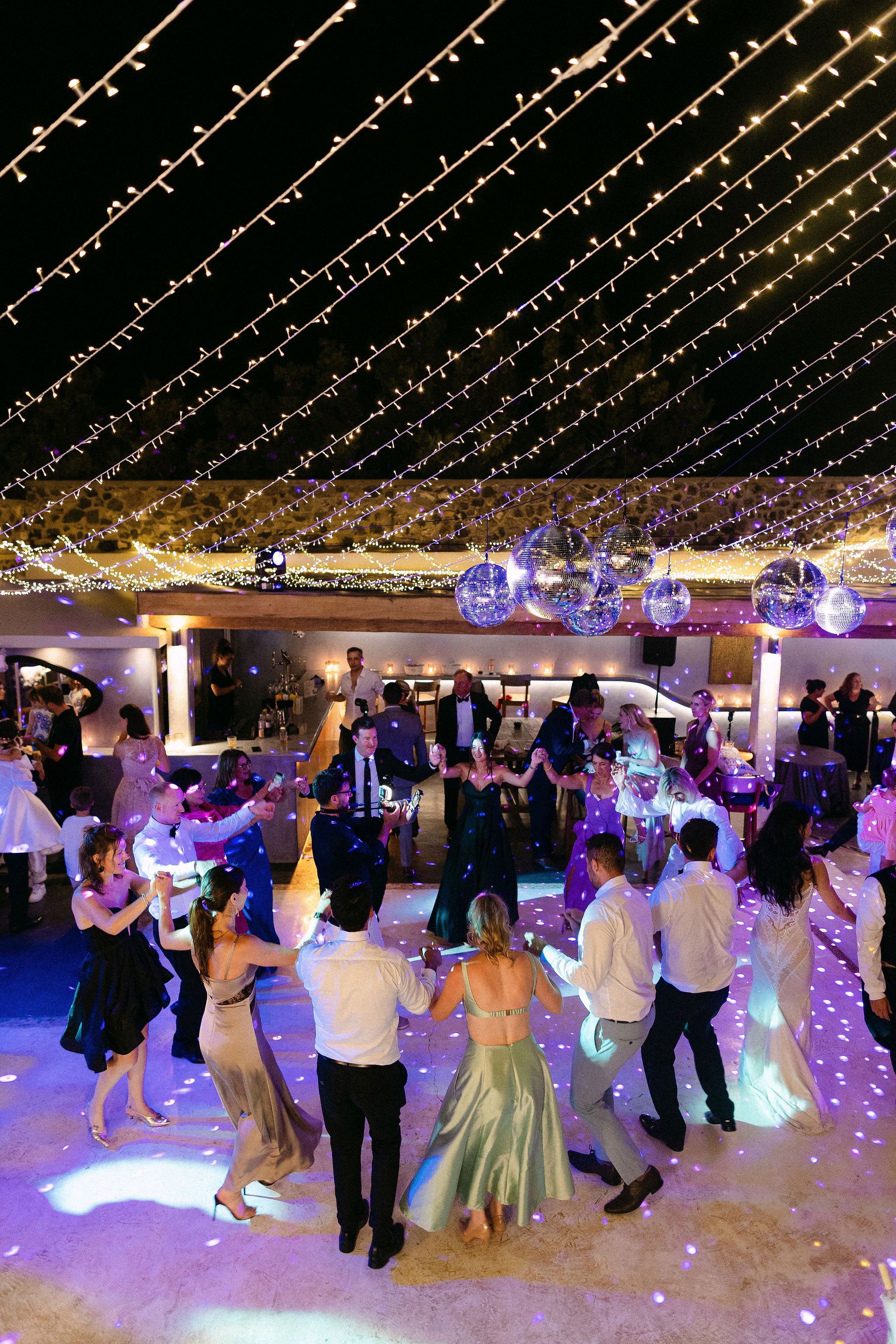 The couple decided on an impressive four-tier wedding cake engraved with their initials and Cavo Ventus, one of the Best Wedding Venues in Greece, evolved into a lively dance floor beneath twinkling string lights and shimmering disco balls. The party was complete with a band and professional Greek dancers invited everyone to join the sirtaki, creating an unforgettable cultural moment that captured the essence of a Destination Wedding in Greece.