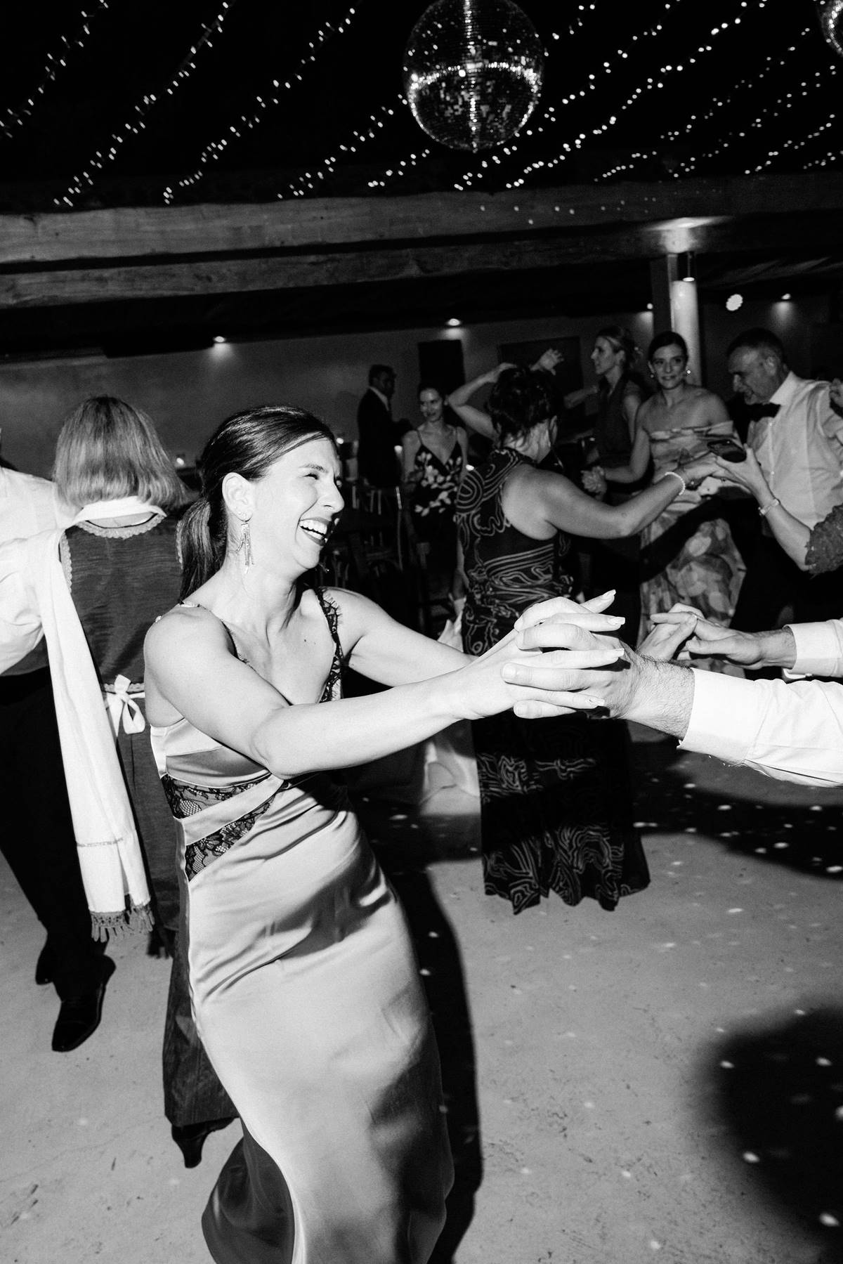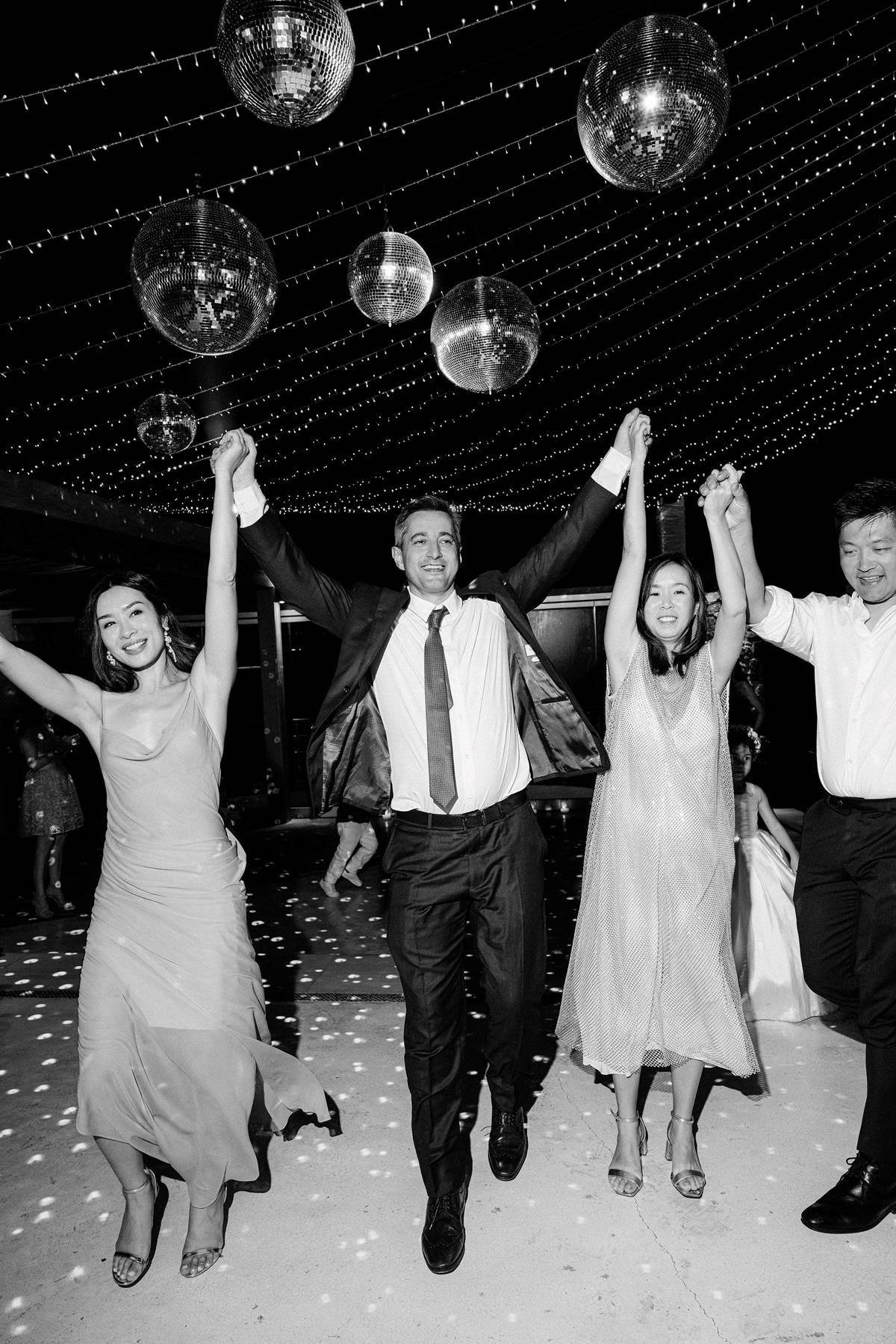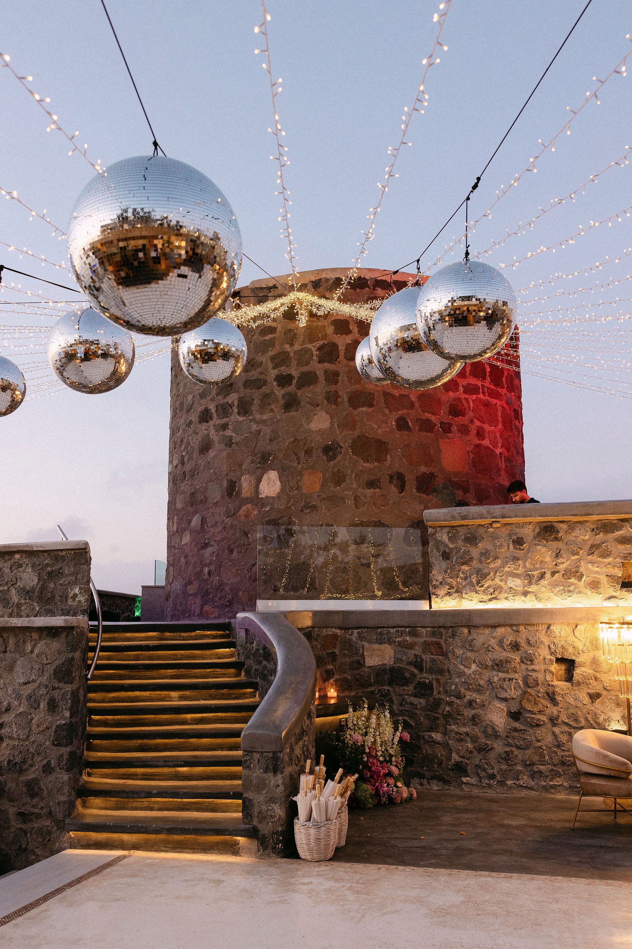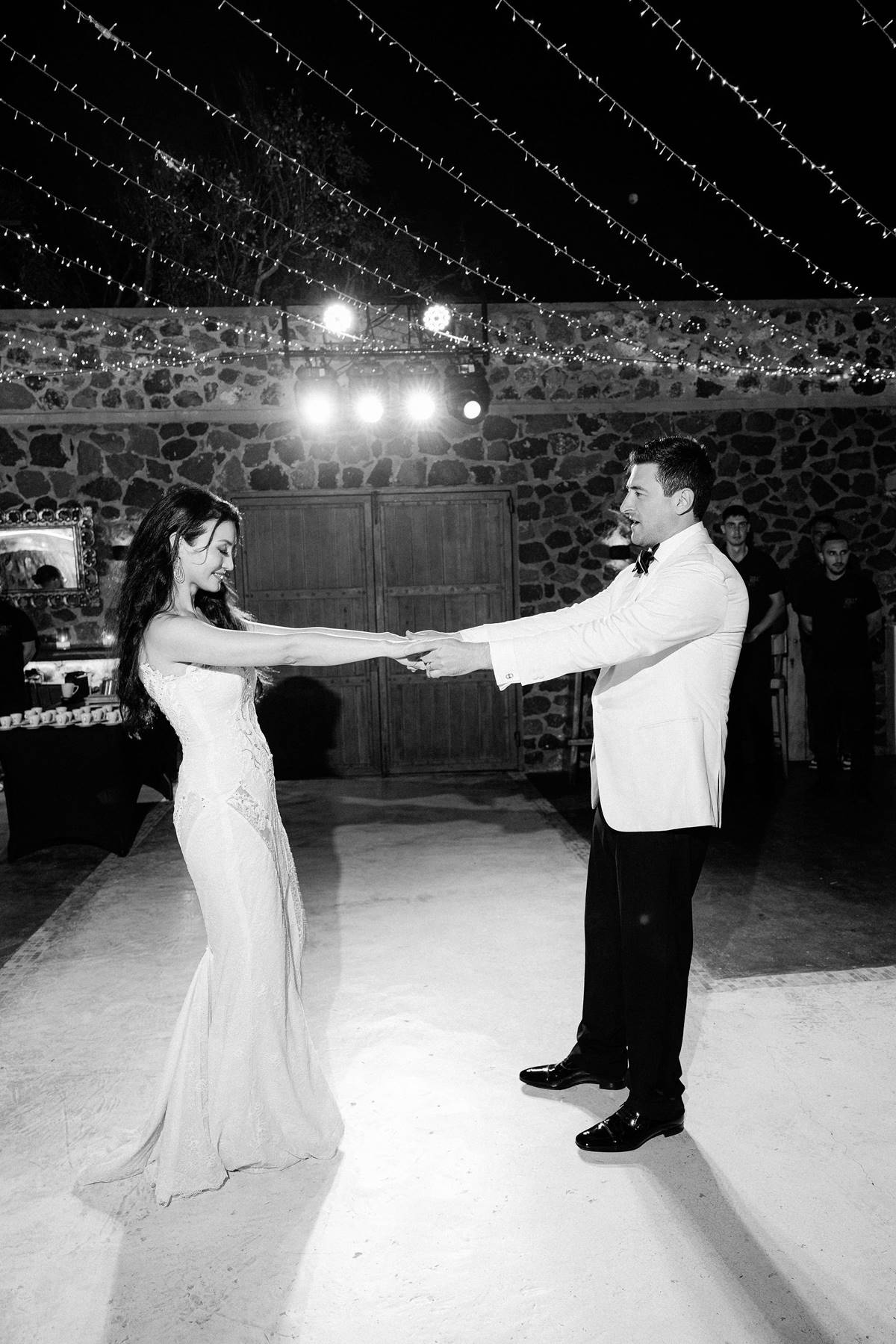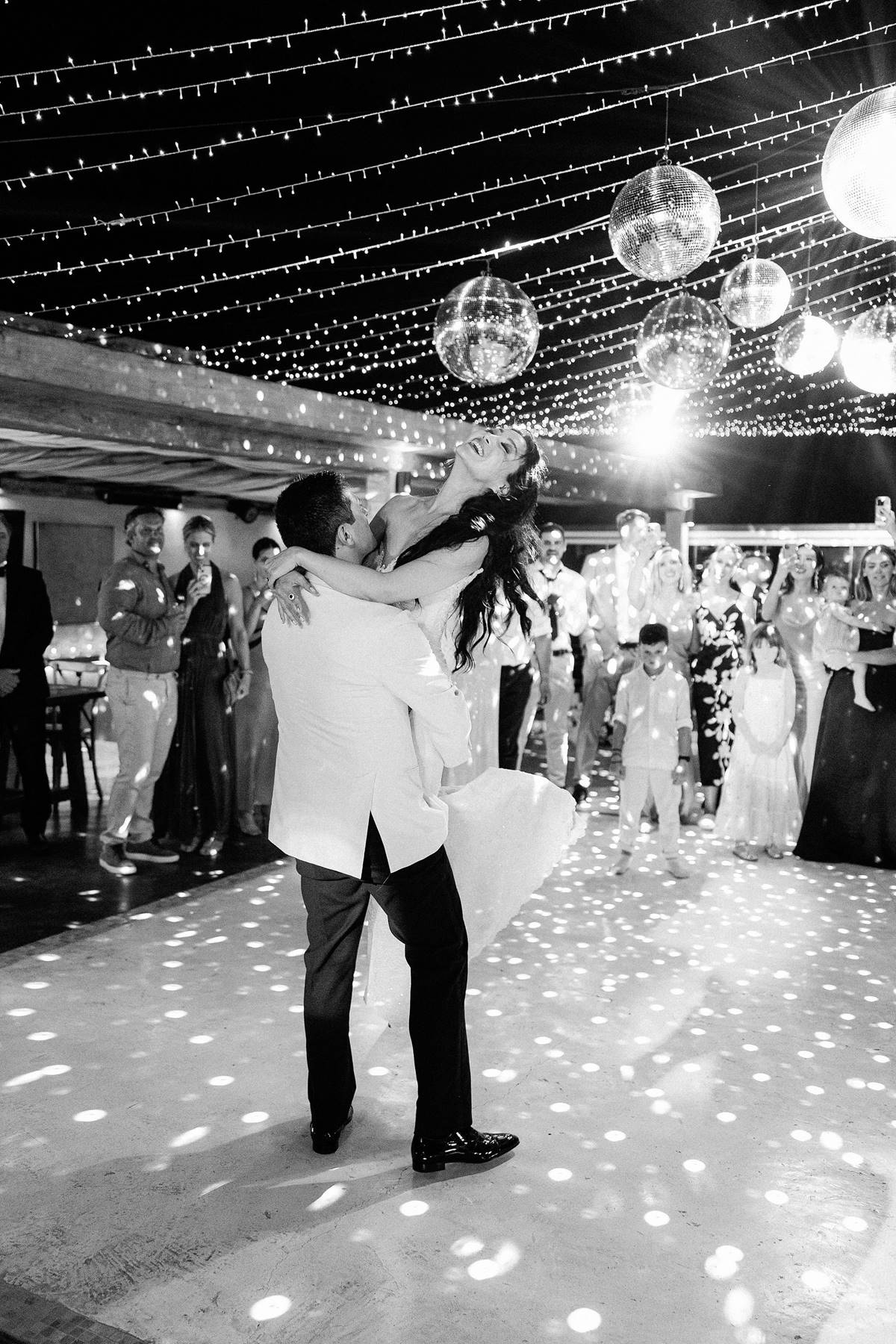 The couple decided on an impressive four-tier wedding cake engraved with their initials and Cavo Ventus, one of the Best Wedding Venues in Greece, evolved into a lively dance floor beneath twinkling string lights and shimmering disco balls. The party was complete with a band and professional Greek dancers invited everyone to join the sirtaki, creating an unforgettable cultural moment that captured the essence of a Destination Wedding in Greece.