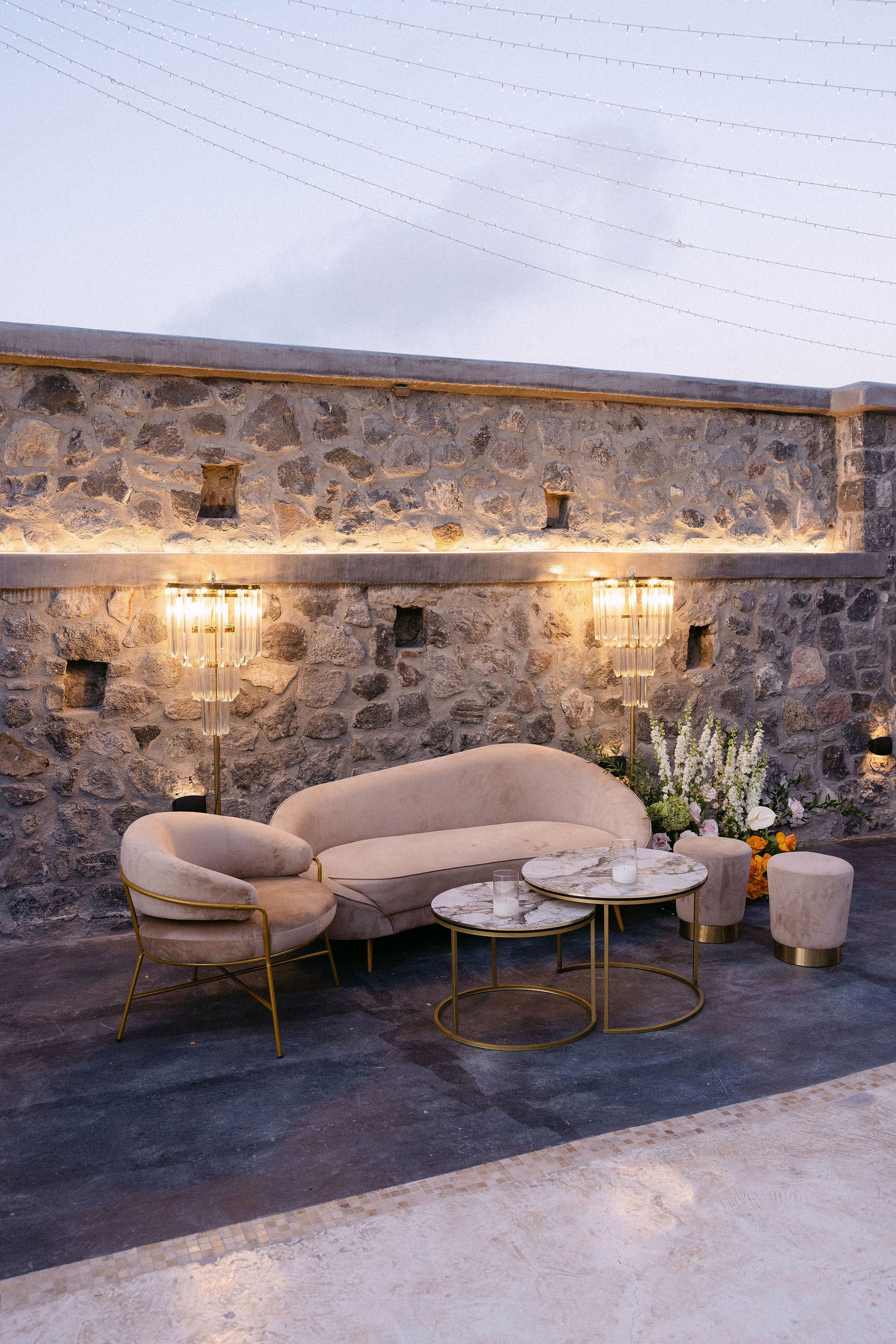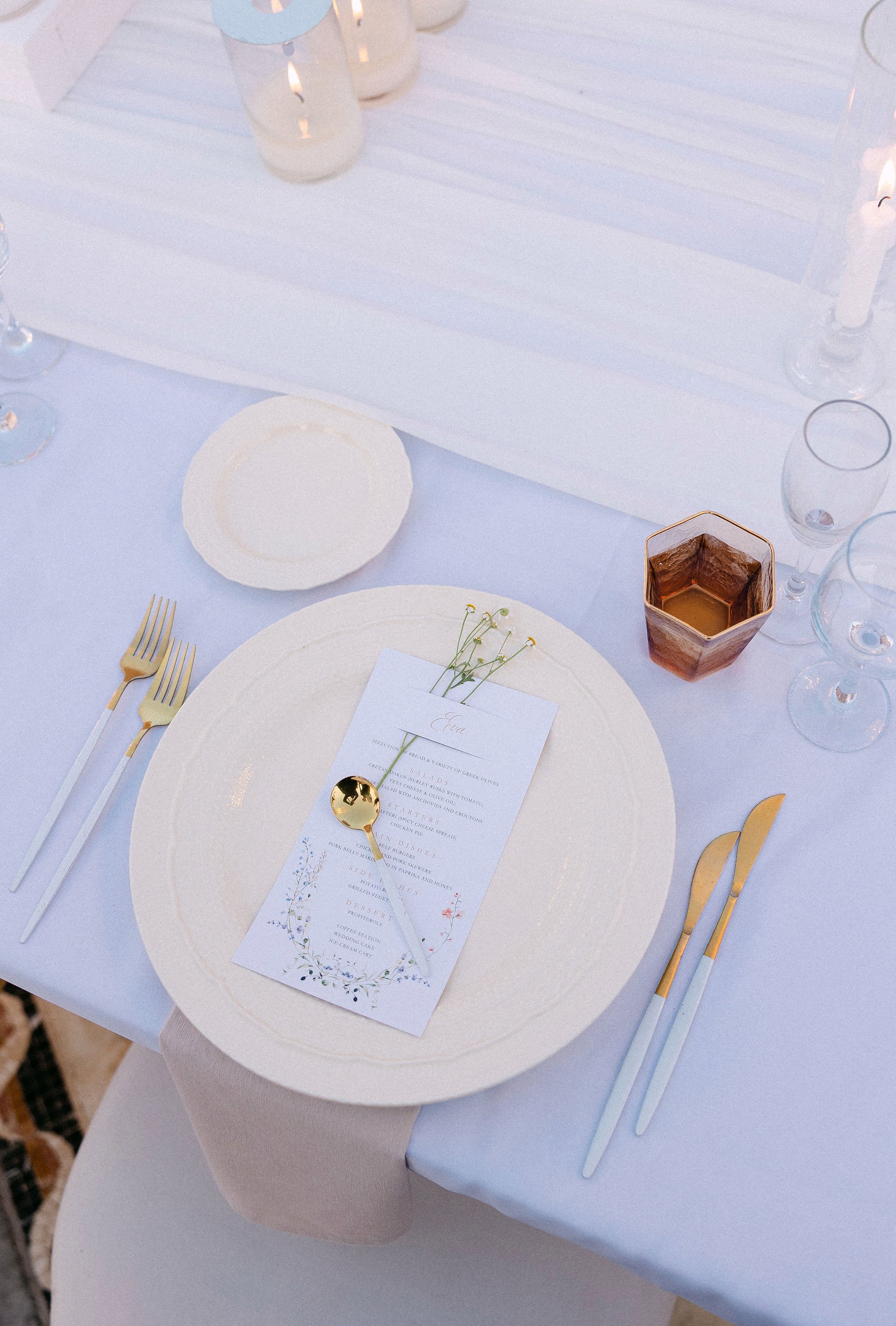 For the reception, guests gathered around an impressive long dinner table set under crystal chandeliers, overflowing florals, and hundreds of candles that created a warm, intimate glow — a signature design of timeless refinement. Live performances continued through the cocktail hour, with piano, saxophone, and vocals setting the tone for an evening of relaxed luxury.