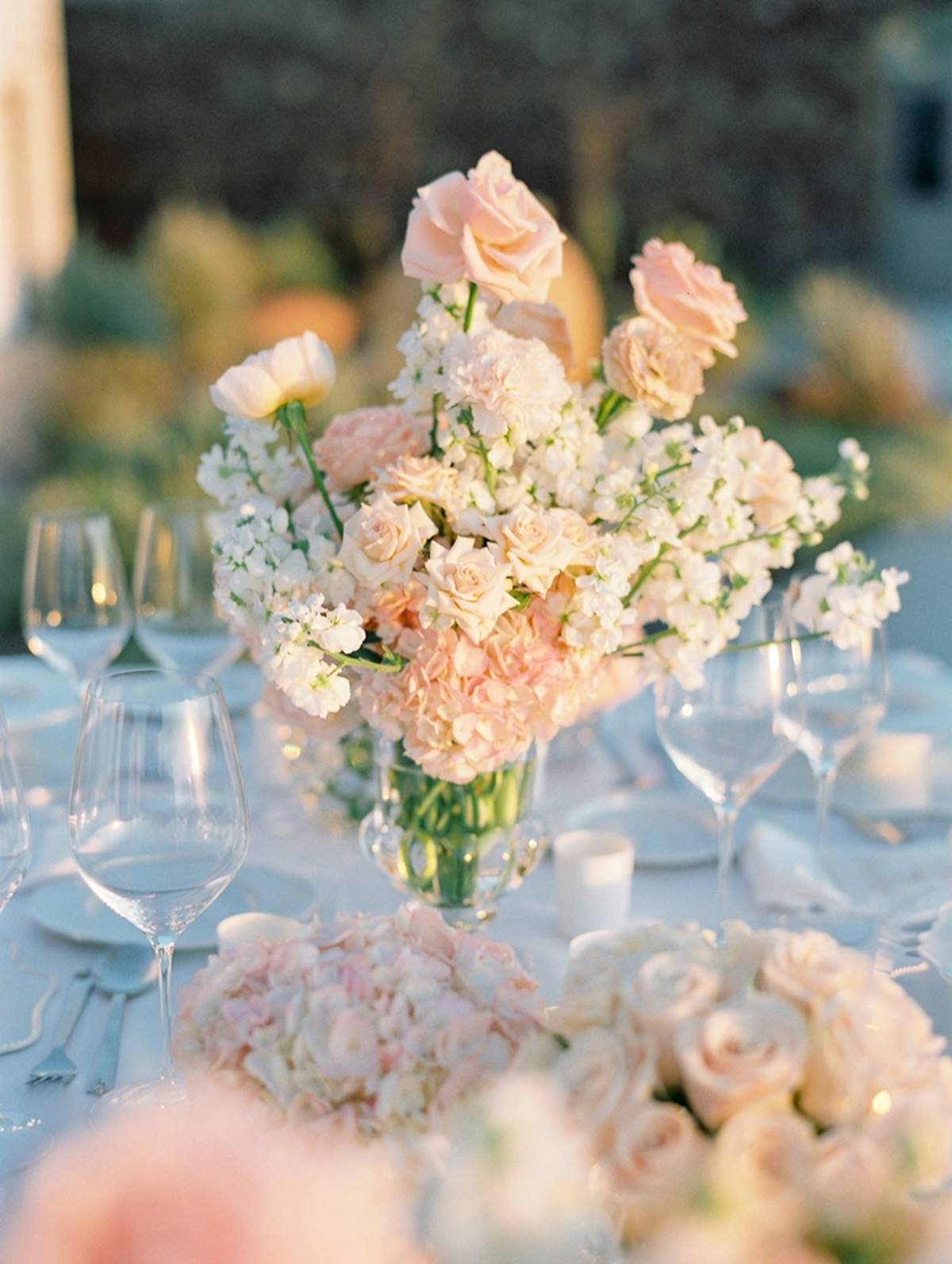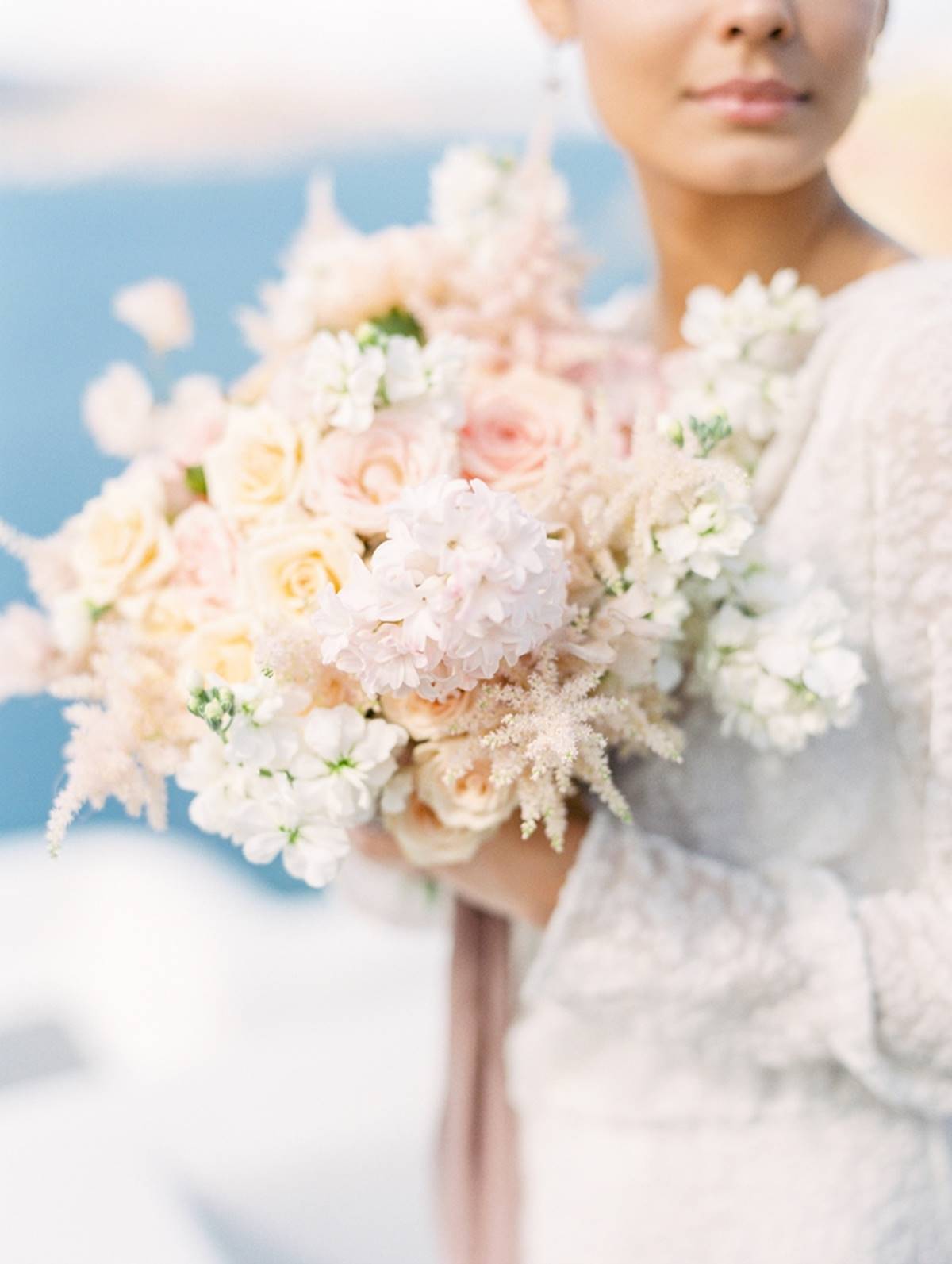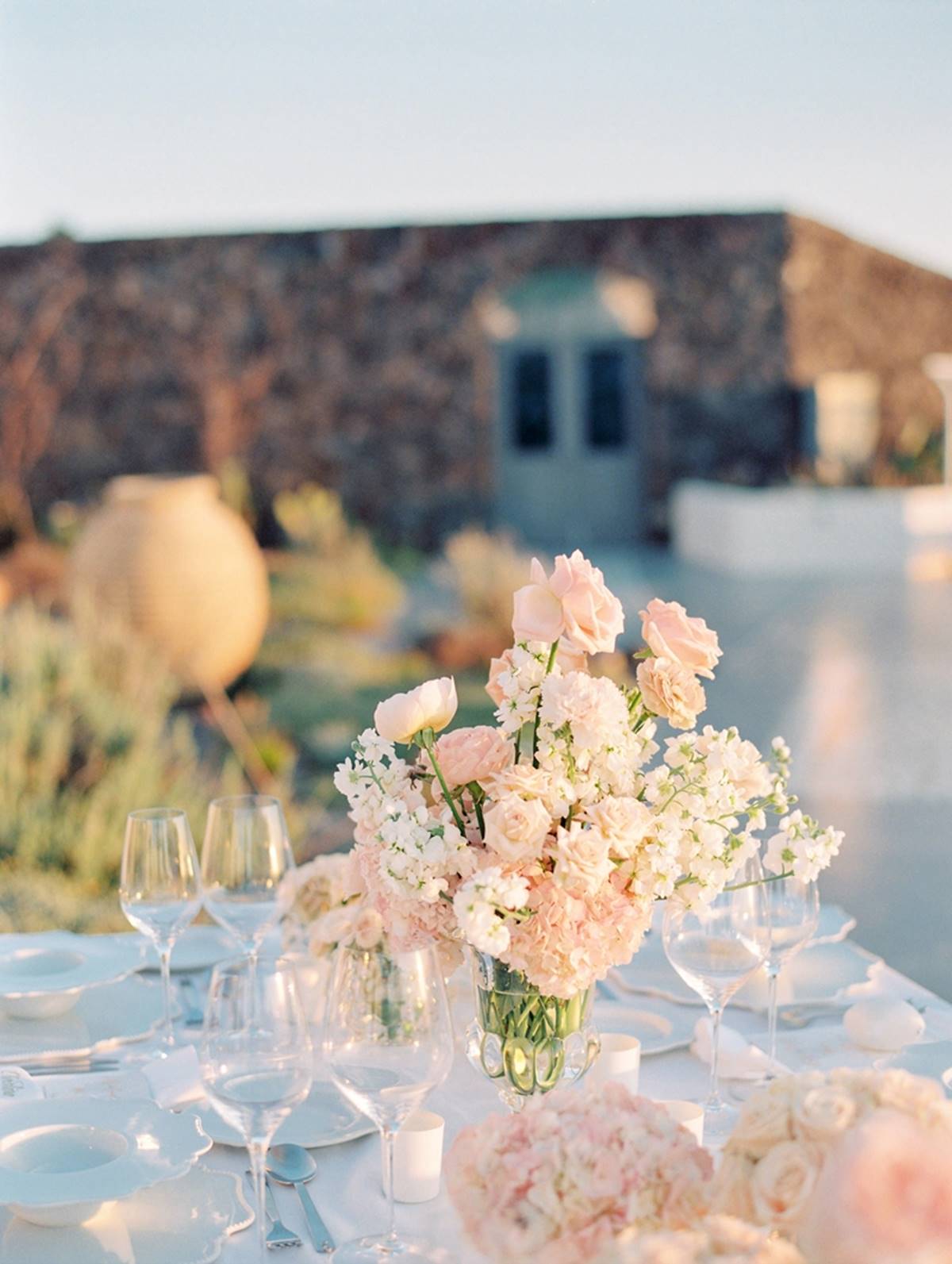 When in Santorini one only needs to find way to complement the surroundings and give the day a sense of festivity without exaggerations. A wonderful canvas like the Aegean sea allows for high-end lavishness with flower arrangements full of sweet peas, carnations, garden and spray roses as well as violets in a pastel palette of blush, peach and ivory tones.