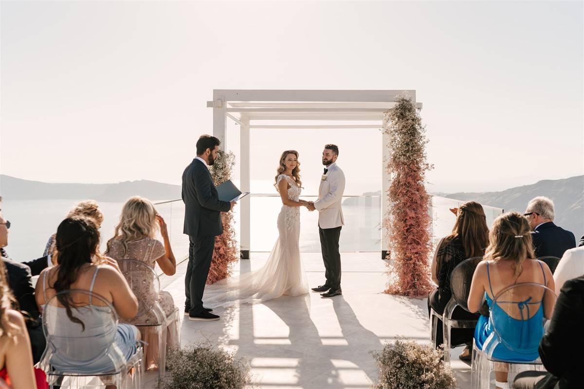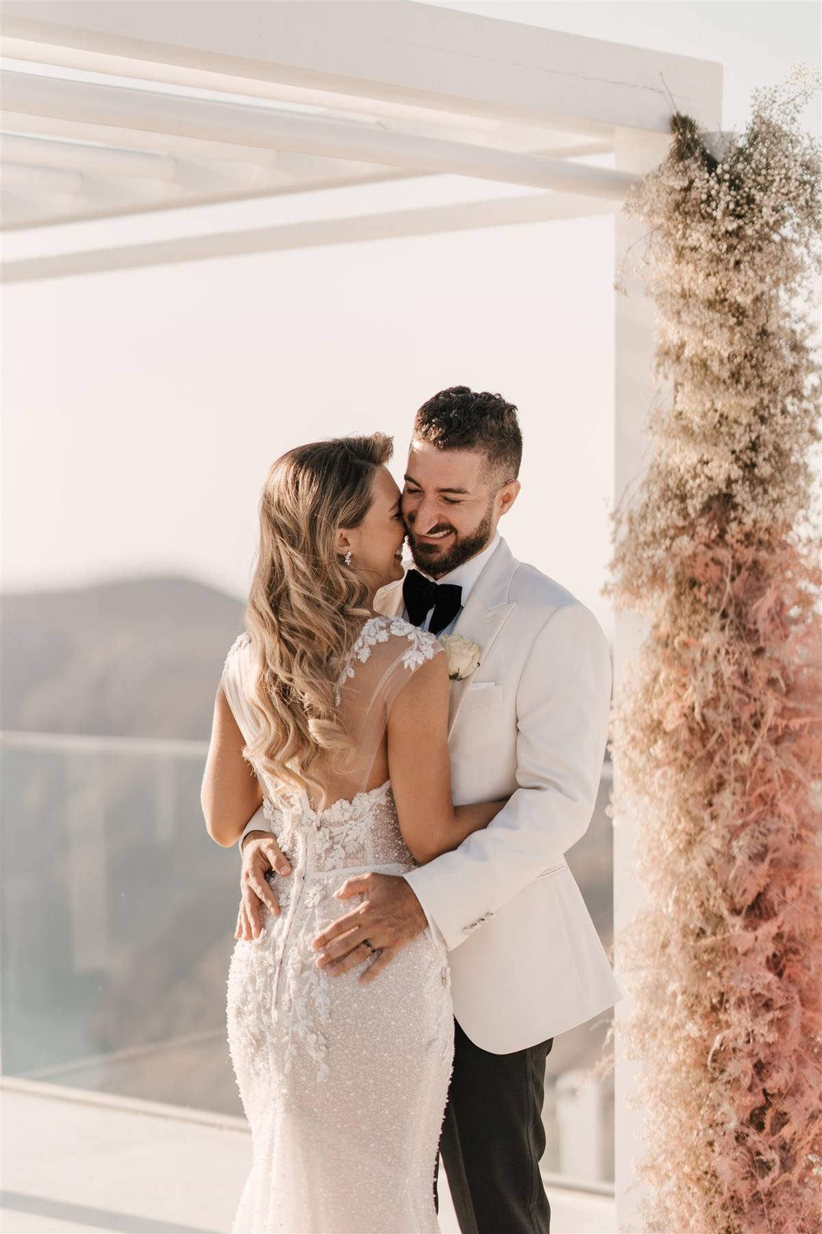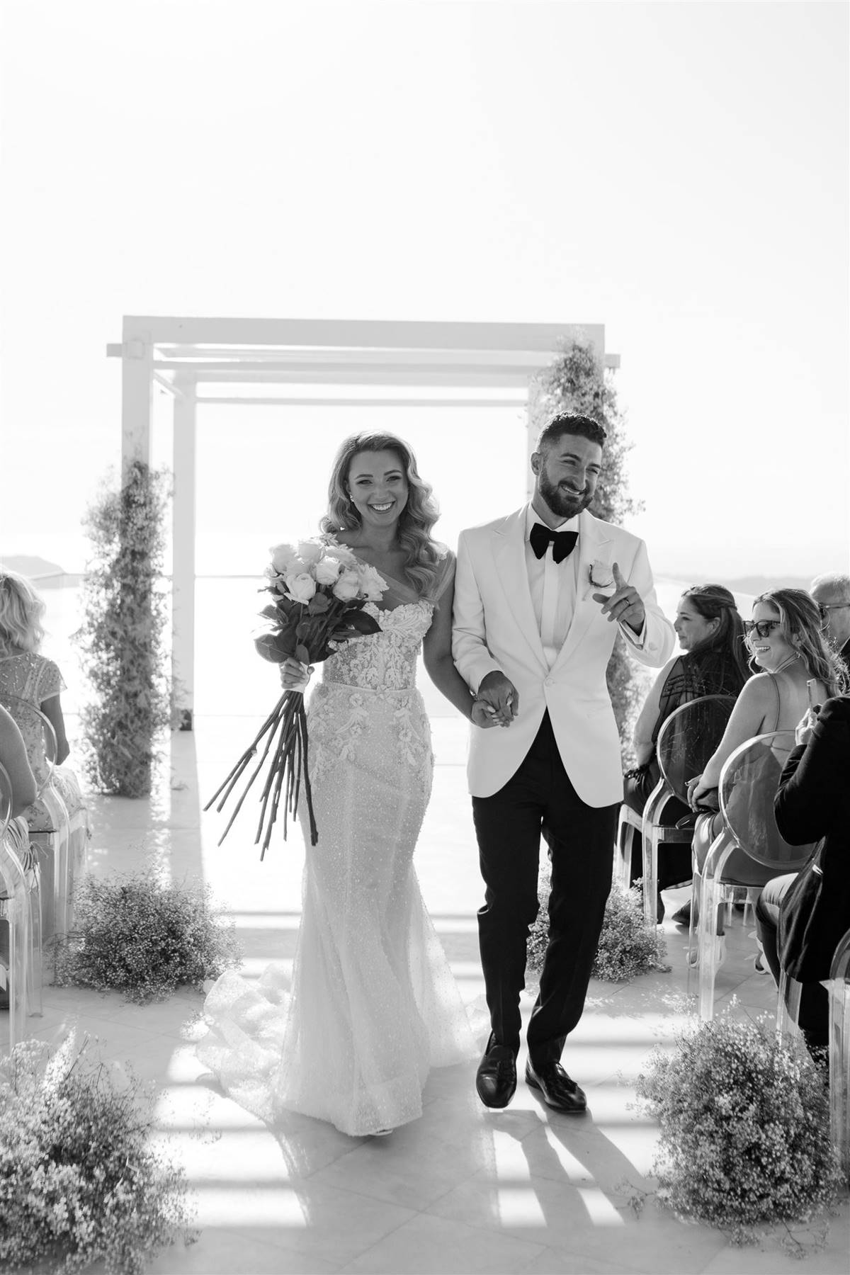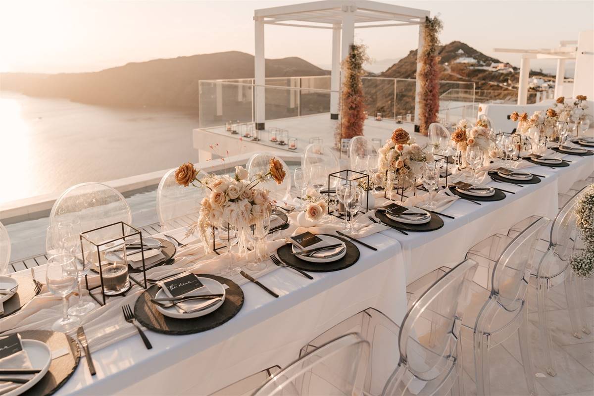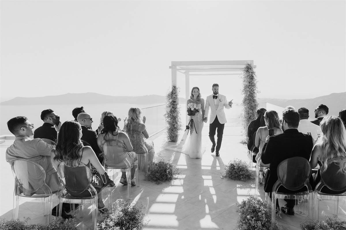 There is nothing but pure magic about Samantha and Daniel’s wedding! They chose the island of Santorini to say their I-dos, in a private and most romantic setting. And you can’t really go more romantic than a ceremony and dinner overlooking the sun setting in the Aegean. Endless cliff views, a classic color palette with a lively pop of black, and timeless details – talk about a truly modern and romantic wedding in the Greek Islands.
