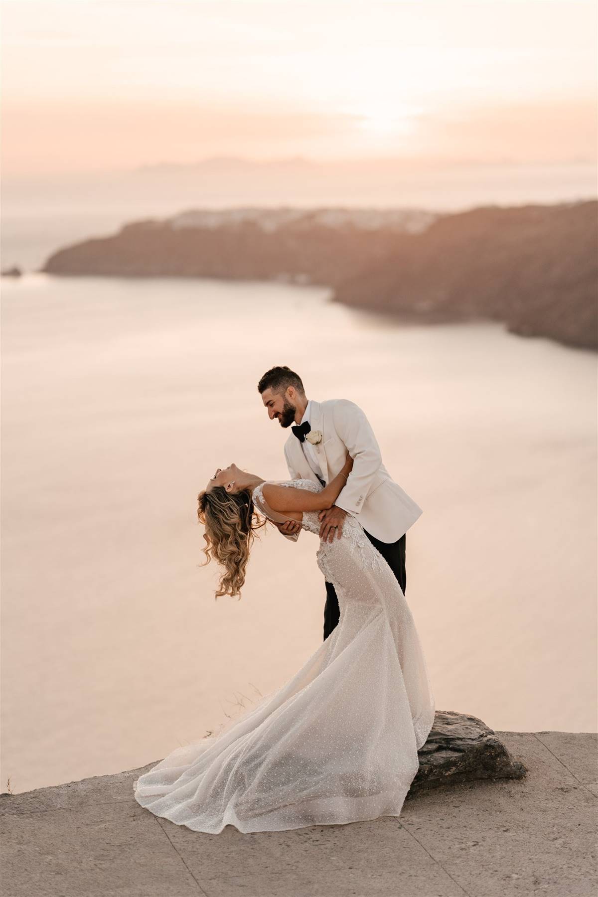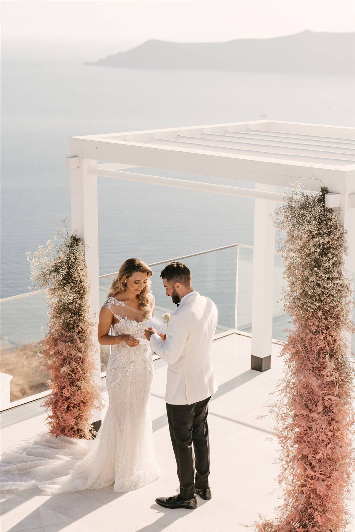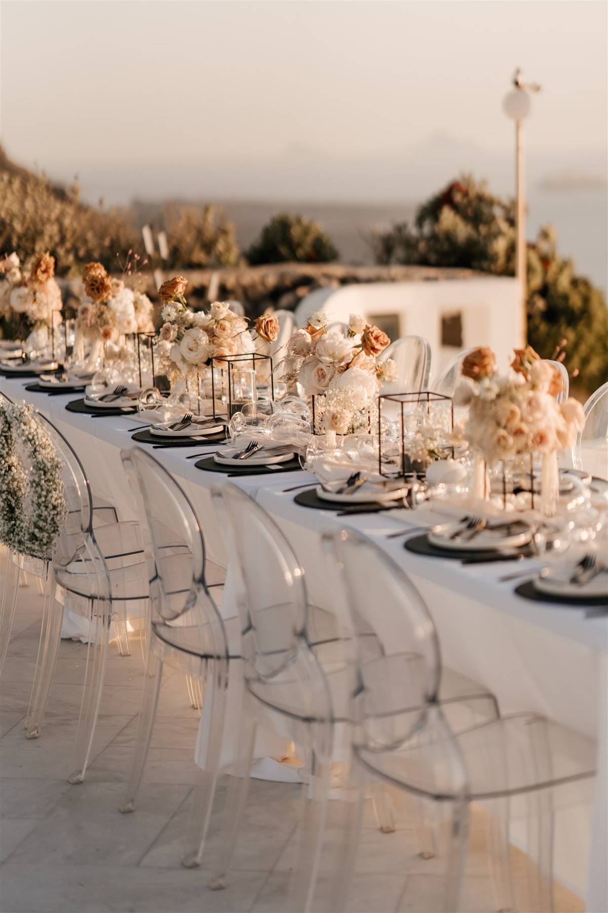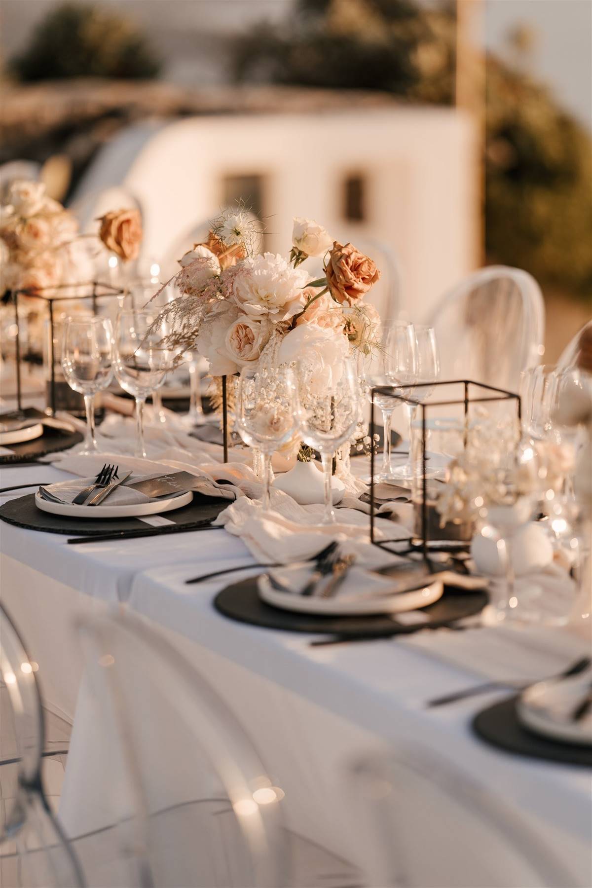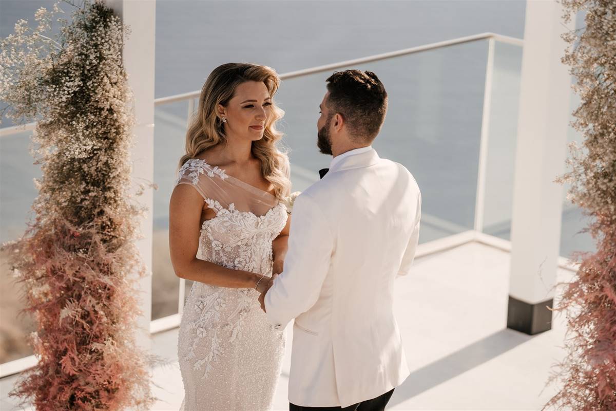 There is nothing but pure magic about Samantha and Daniel’s wedding! They chose the island of Santorini to say their I-dos, in a private and most romantic setting. And you can’t really go more romantic than a ceremony and dinner overlooking the sun setting in the Aegean. Endless cliff views, a classic color palette with a lively pop of black, and timeless details – talk about a truly modern and romantic wedding in the Greek Islands.