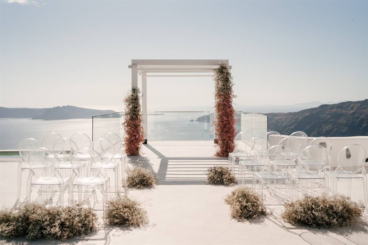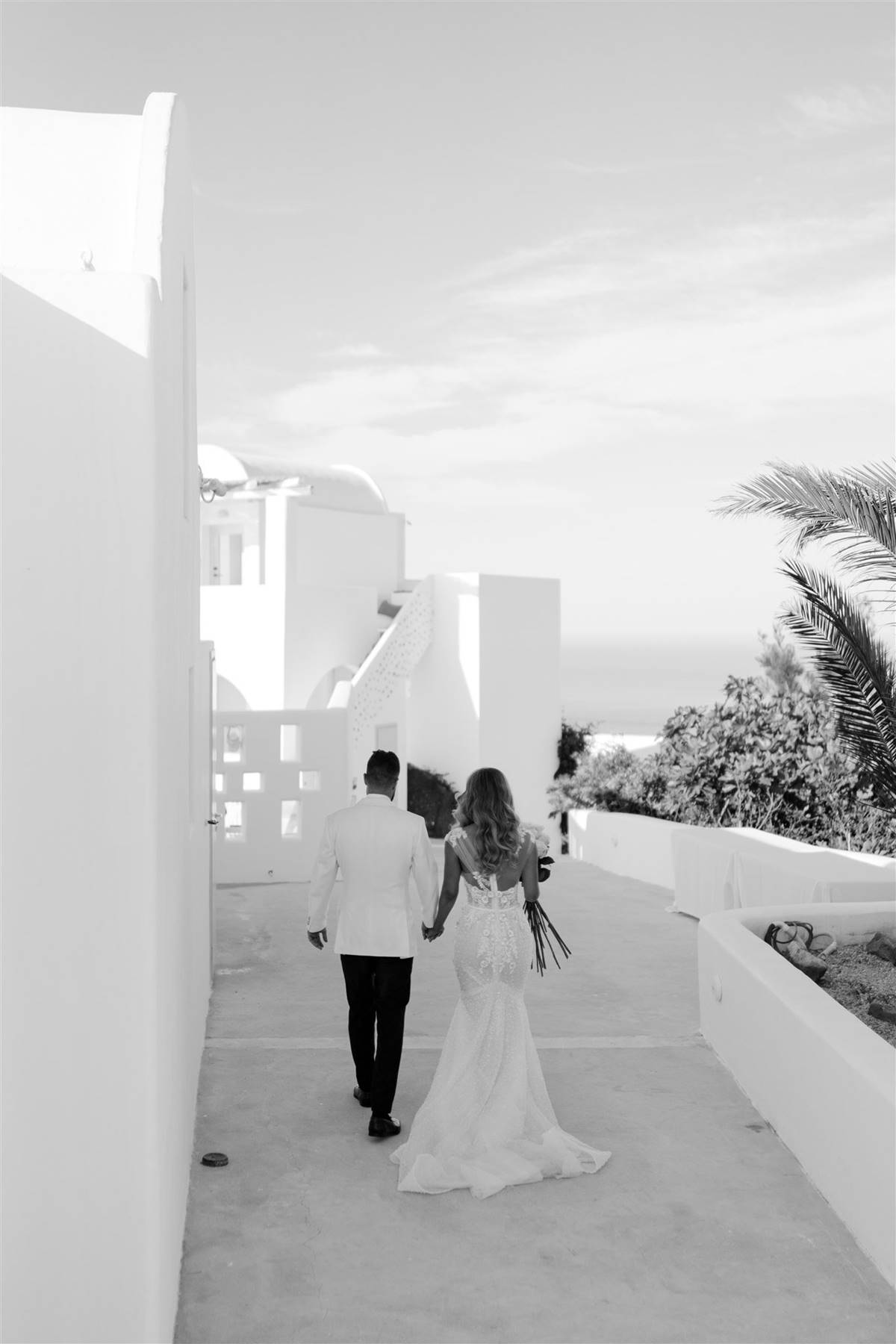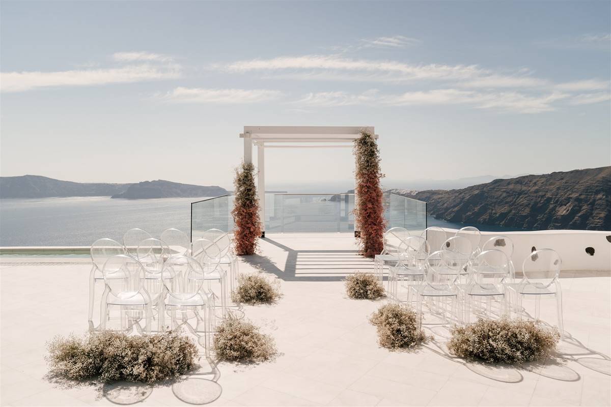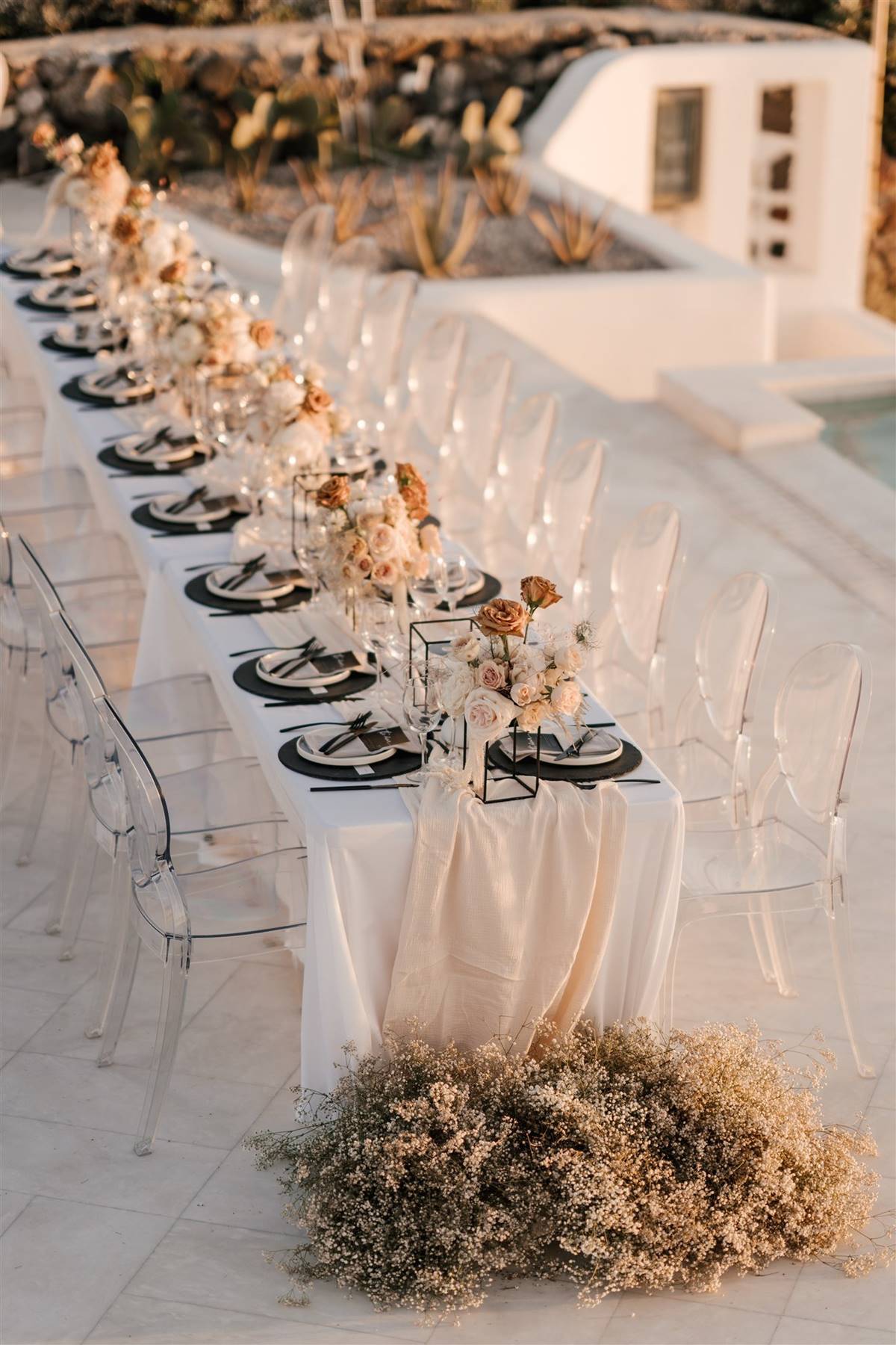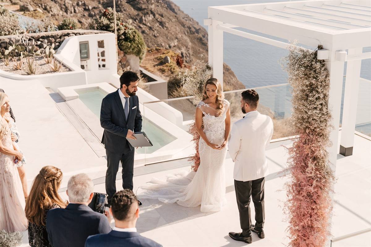 There is nothing but pure magic about Samantha and Daniel’s wedding! They chose the island of Santorini to say their I-dos, in a private and most romantic setting. And you can’t really go more romantic than a ceremony and dinner overlooking the sun setting in the Aegean. Endless cliff views, a classic color palette with a lively pop of black, and timeless details – talk about a truly modern and romantic wedding in the Greek Islands.