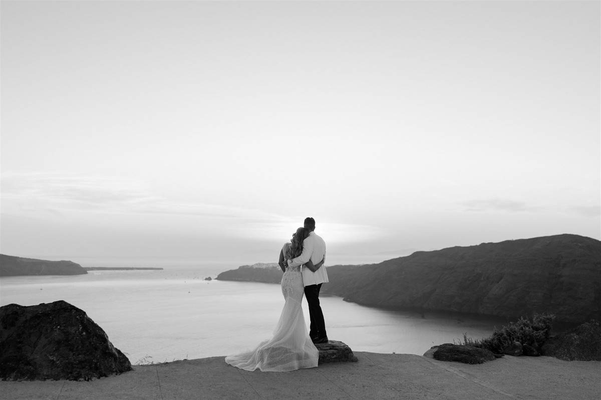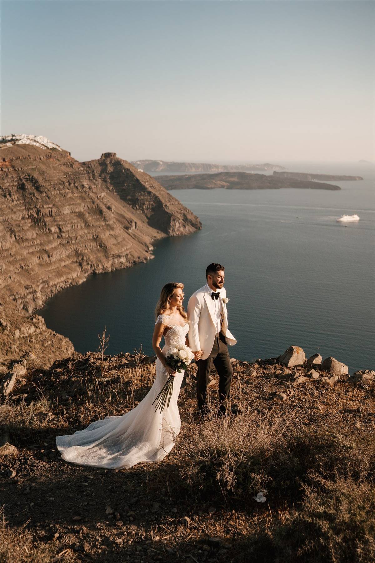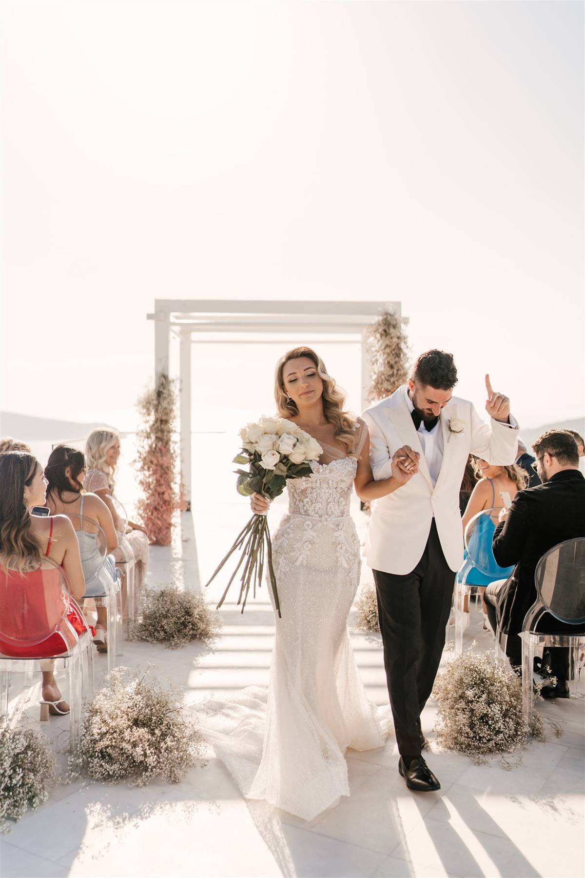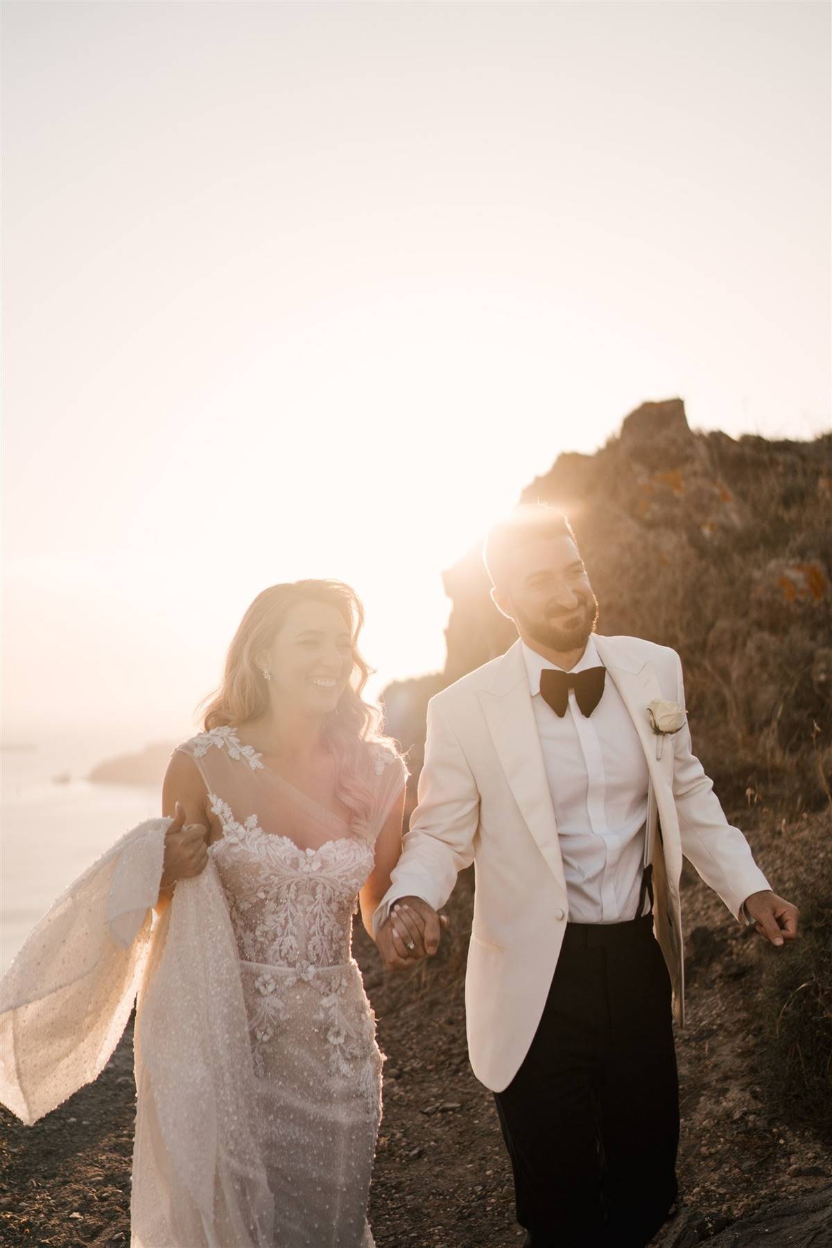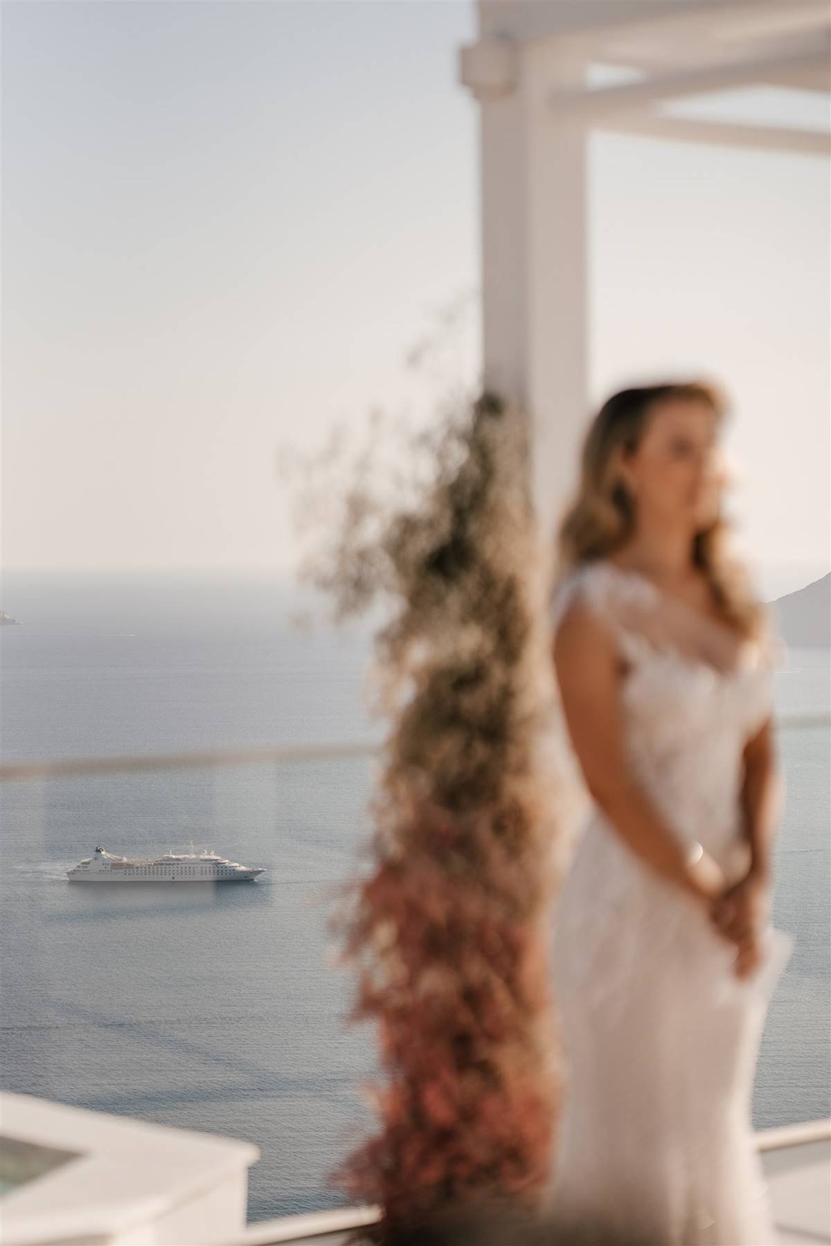 There is nothing but pure magic about Samantha and Daniel’s wedding! They chose the island of Santorini to say their I-dos, in a private and most romantic setting. And you can’t really go more romantic than a ceremony and dinner overlooking the sun setting in the Aegean. Endless cliff views, a classic color palette with a lively pop of black, and timeless details – talk about a truly modern and romantic wedding in the Greek Islands.