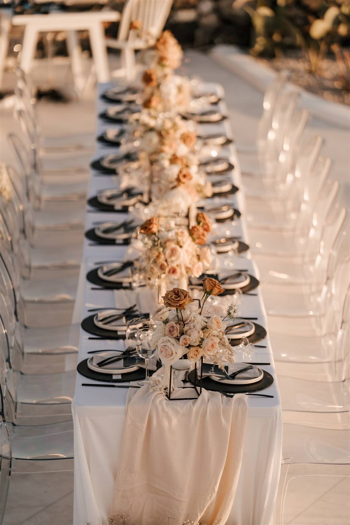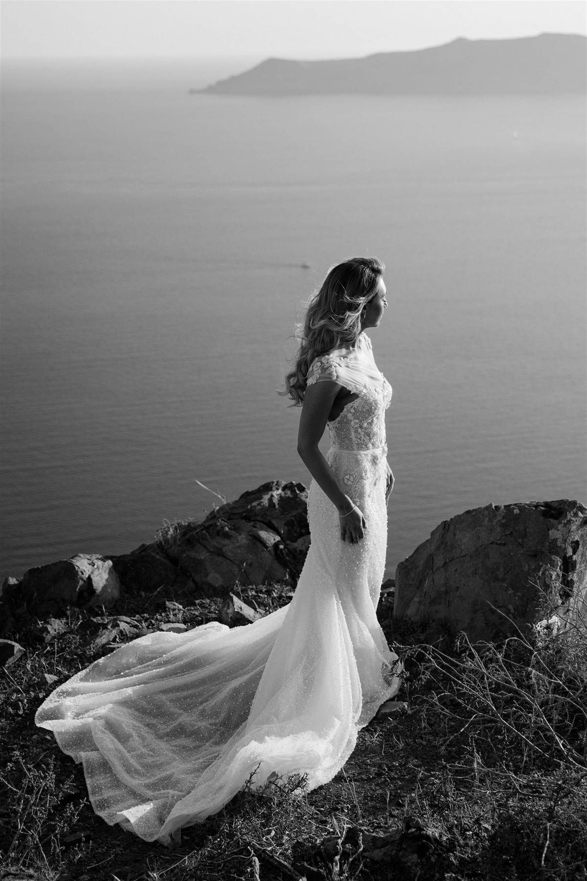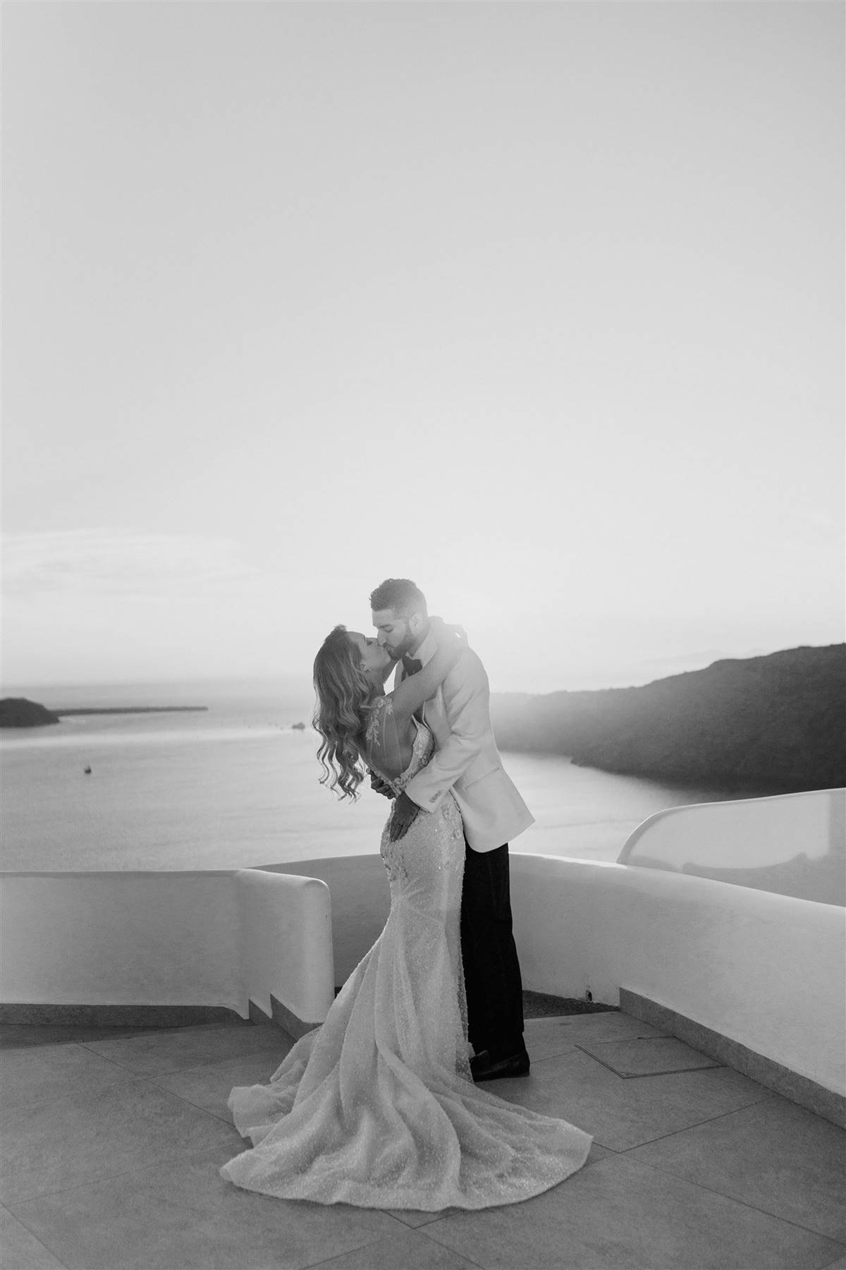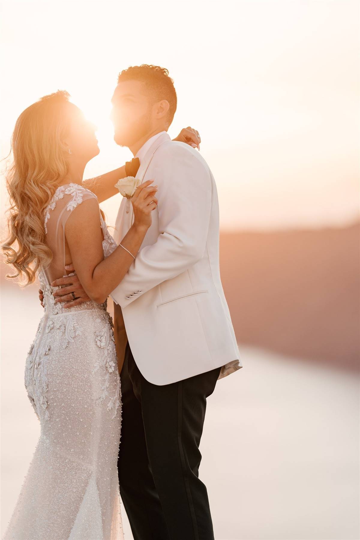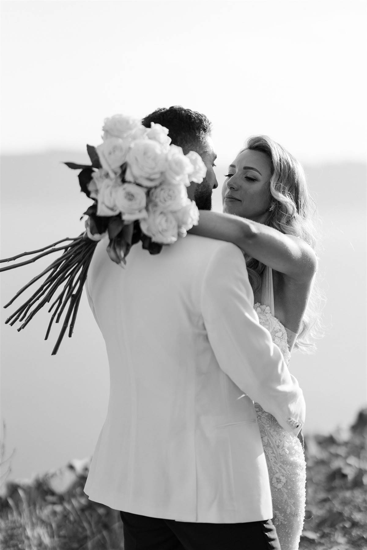 There is nothing but pure magic about Samantha and Daniel’s wedding! They chose the island of Santorini to say their I-dos, in a private and most romantic setting. And you can’t really go more romantic than a ceremony and dinner overlooking the sun setting in the Aegean. Endless cliff views, a classic color palette with a lively pop of black, and timeless details – talk about a truly modern and romantic wedding in the Greek Islands.