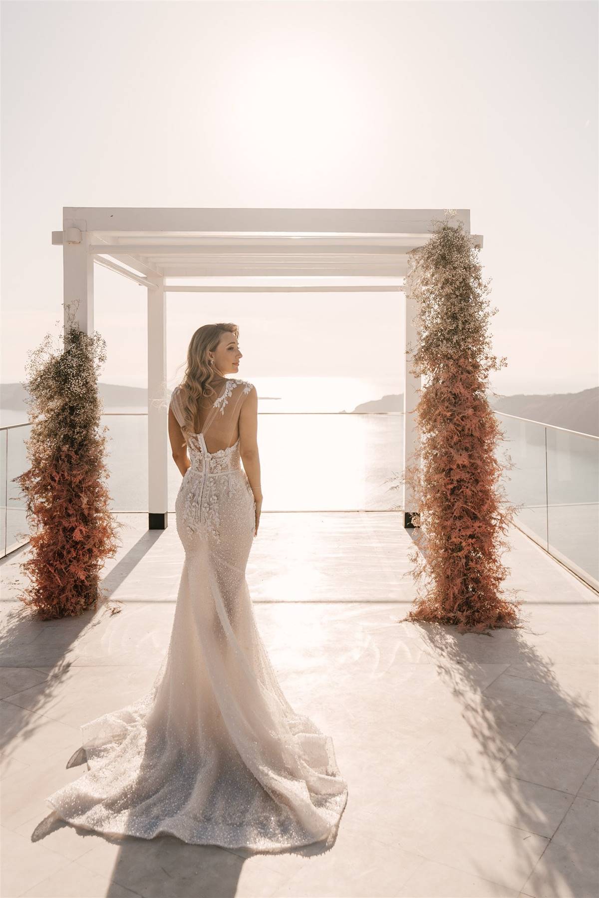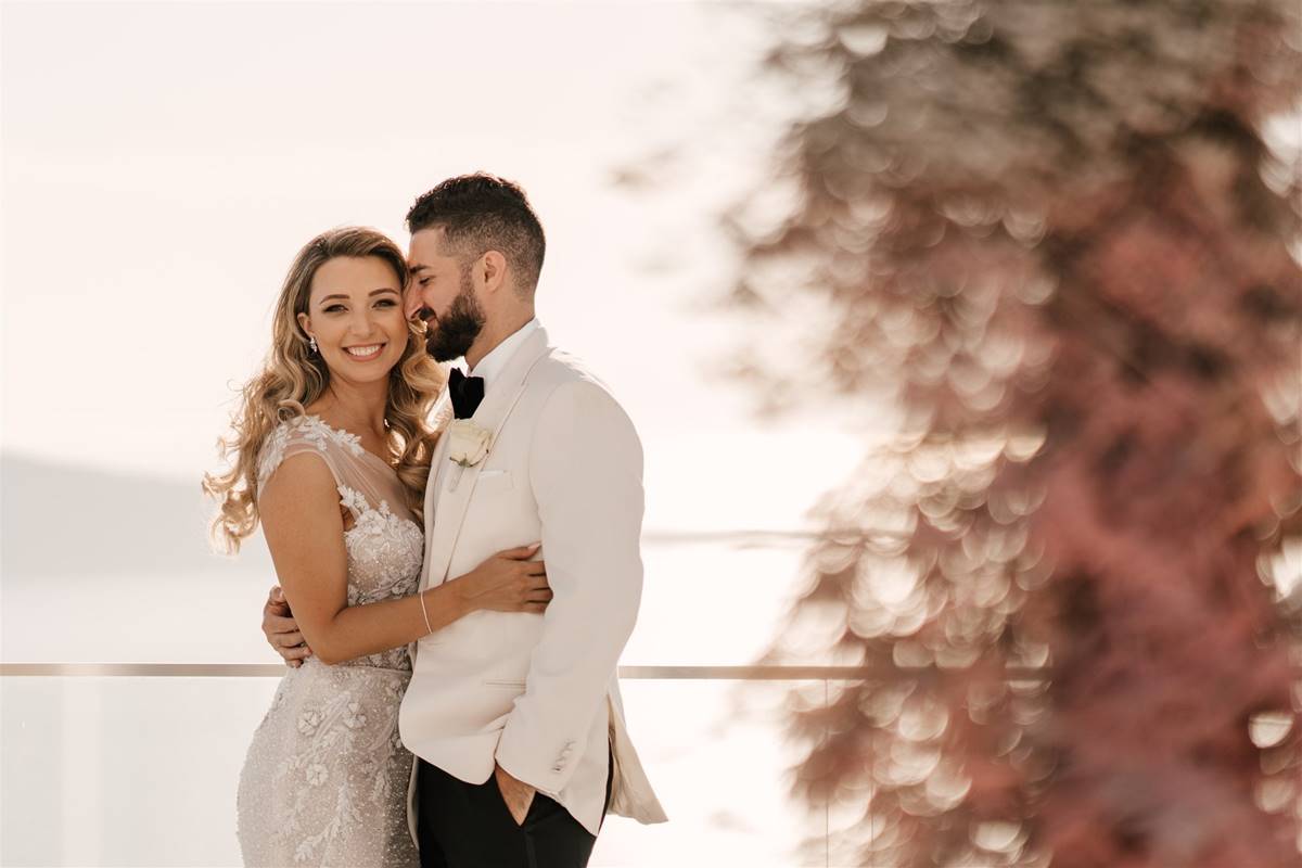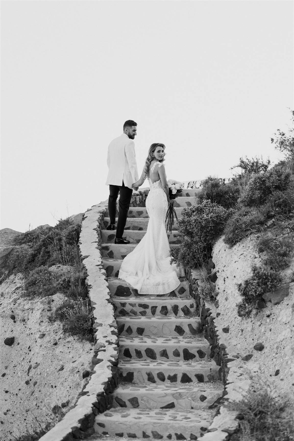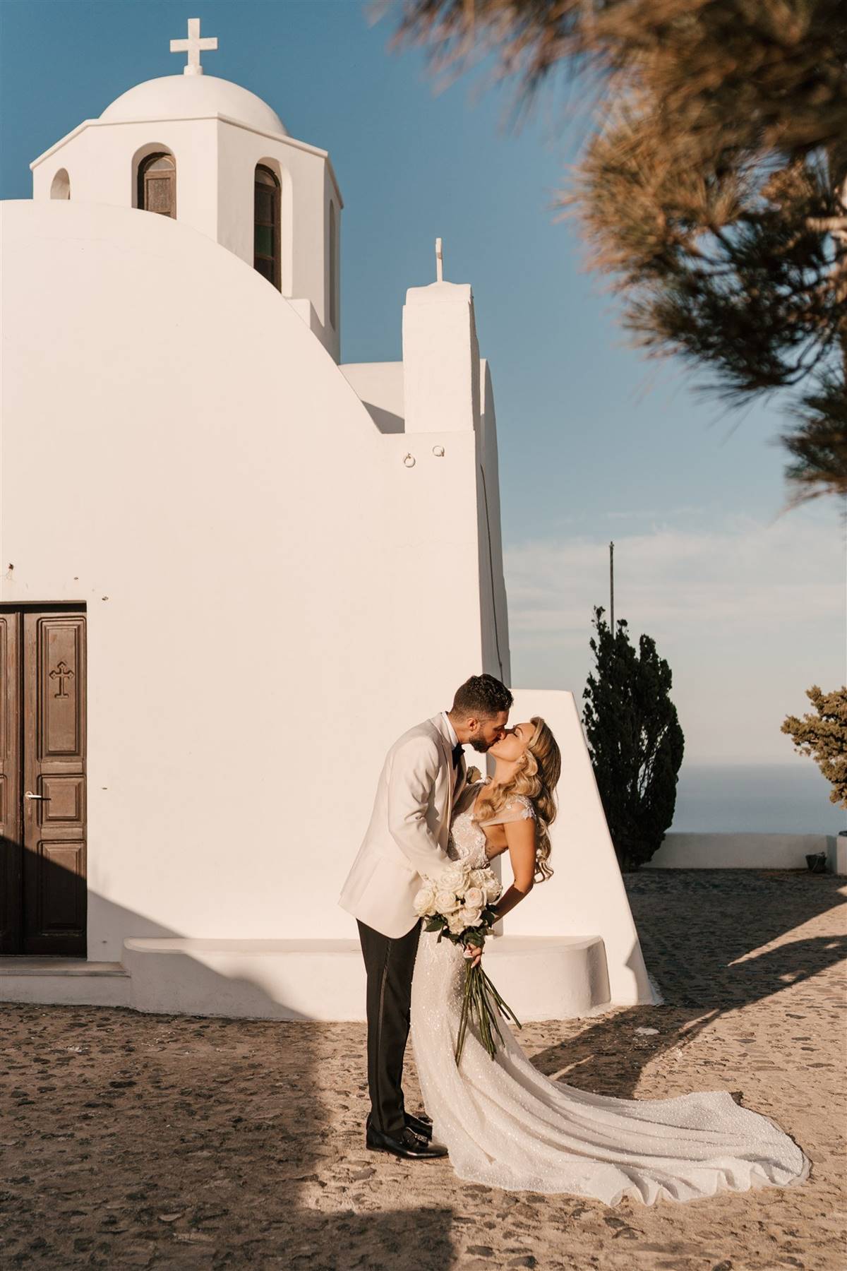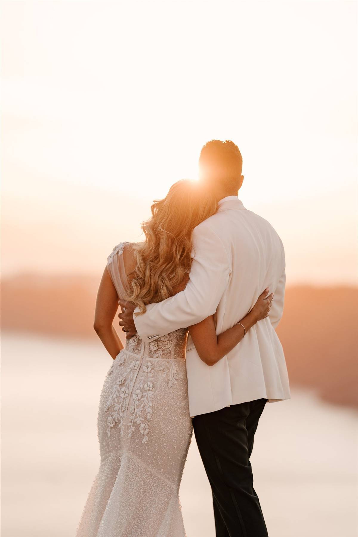 There is nothing but pure magic about Samantha and Daniel’s wedding! They chose the island of Santorini to say their I-dos, in a private and most romantic setting. And you can’t really go more romantic than a ceremony and dinner overlooking the sun setting in the Aegean. Endless cliff views, a classic color palette with a lively pop of black, and timeless details – talk about a truly modern and romantic wedding in the Greek Islands.