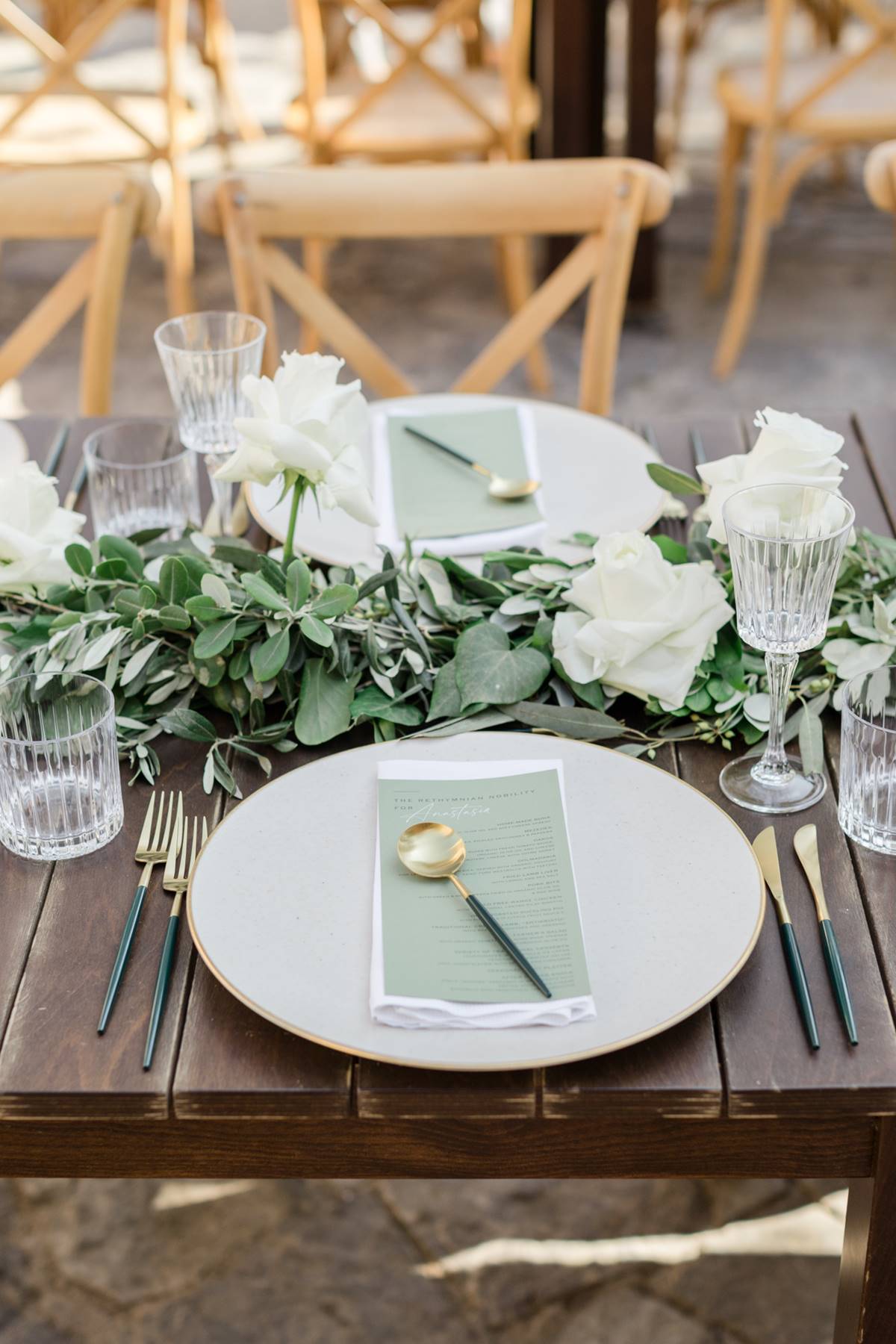 Agreco farm served as the perfect backdrop for a rustic and traditional Greek island wedding, with silvery olive leaves matching the landscape, enhanced by local music and wine. The charm of the farm made it ideal for those seeking a farm wedding with authentic Greek touches.
