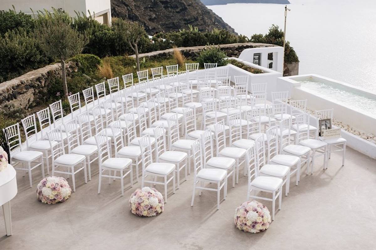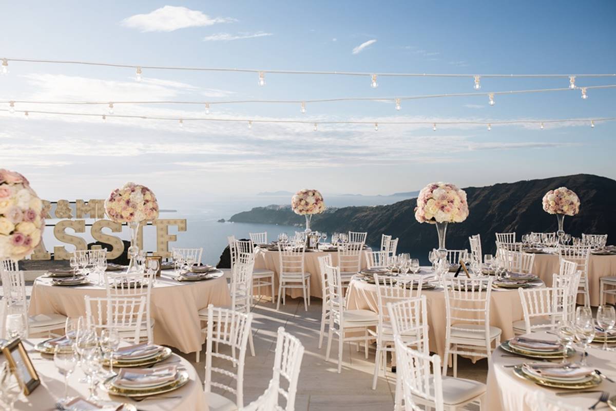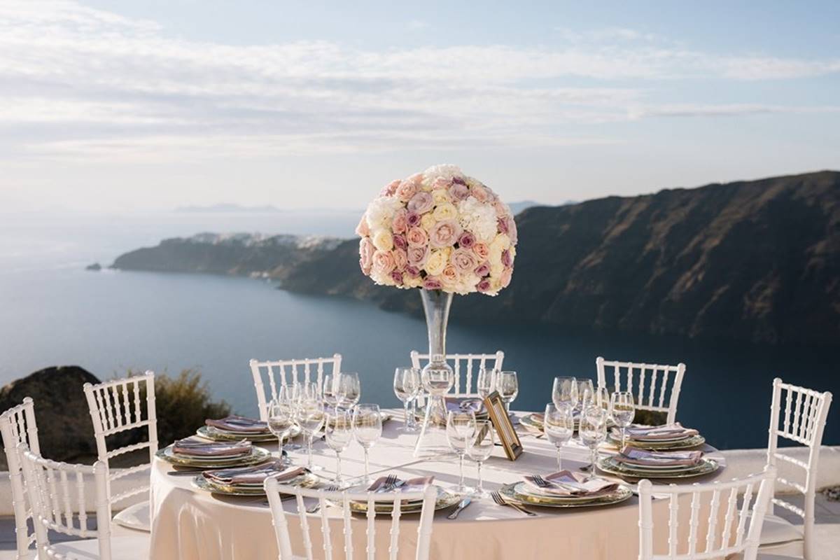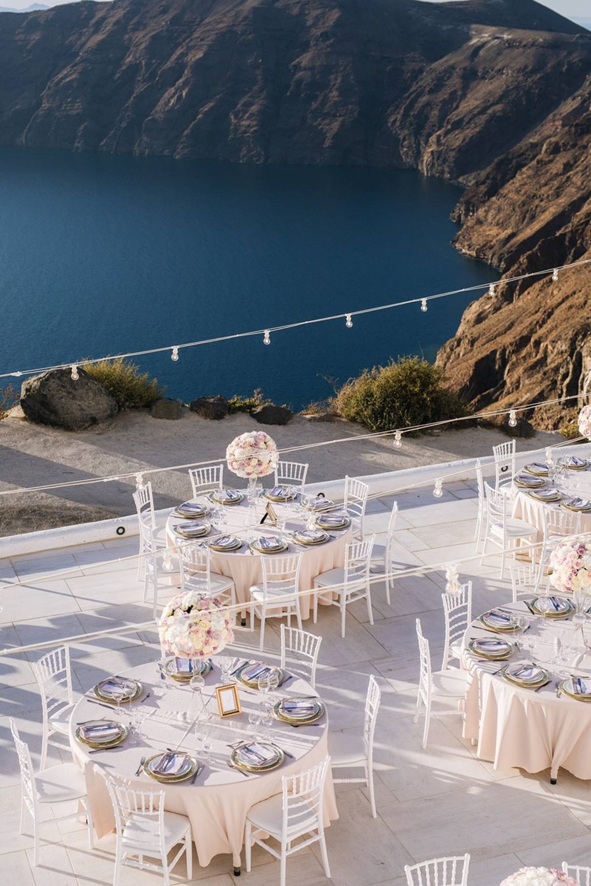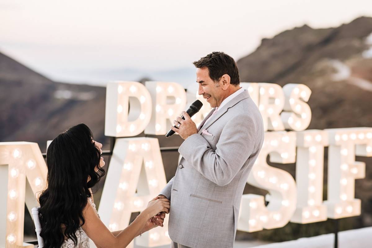 As the sun set behind the Santorini volcano, the guests enjoyed the reception décor and pink/lilac colours that filled Rocabella’s Infinity Pool terrace and Paul surprised Brittany in the most romantic way, with a live performance of Lady Gaga’s “Always Remember Us This Way”.