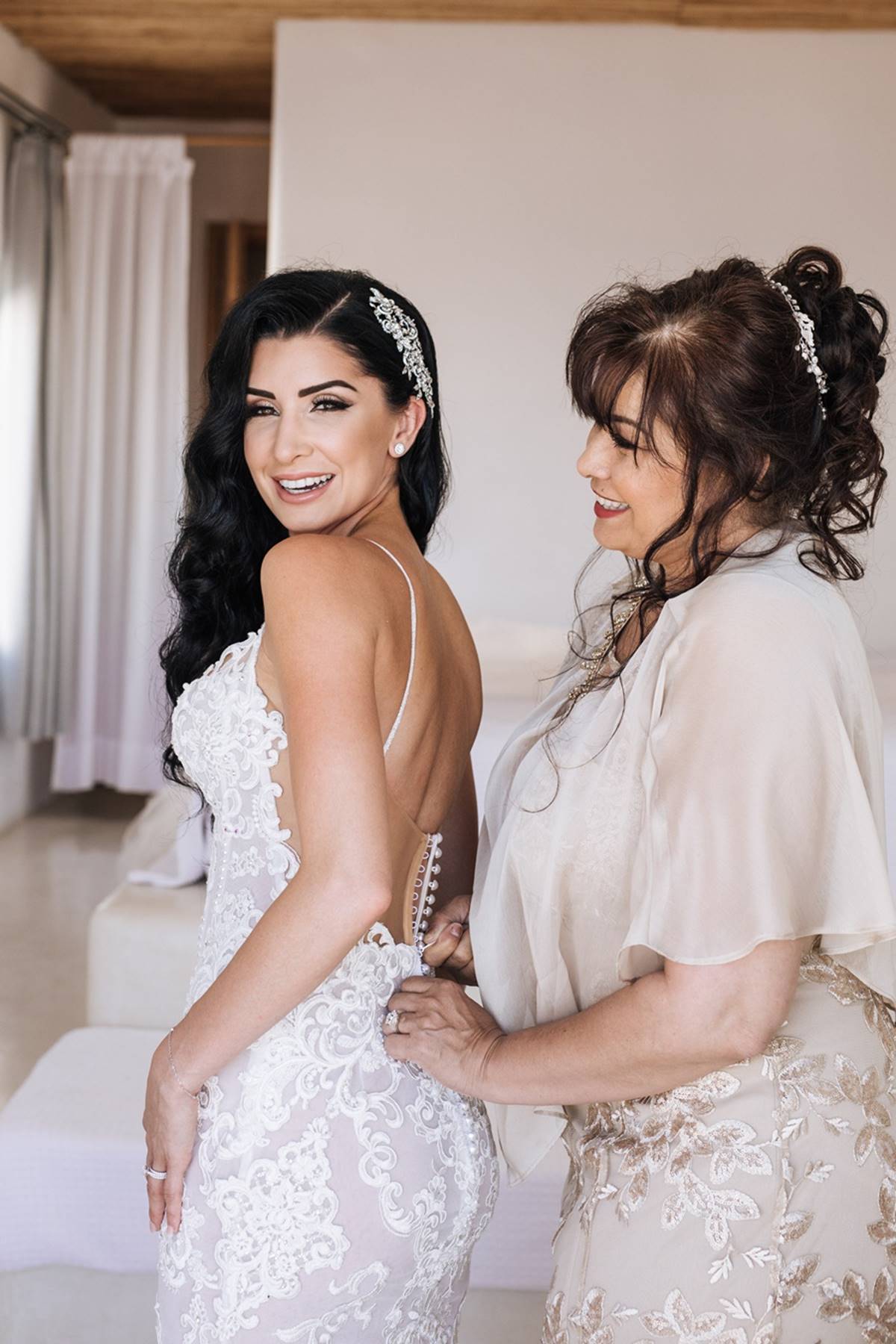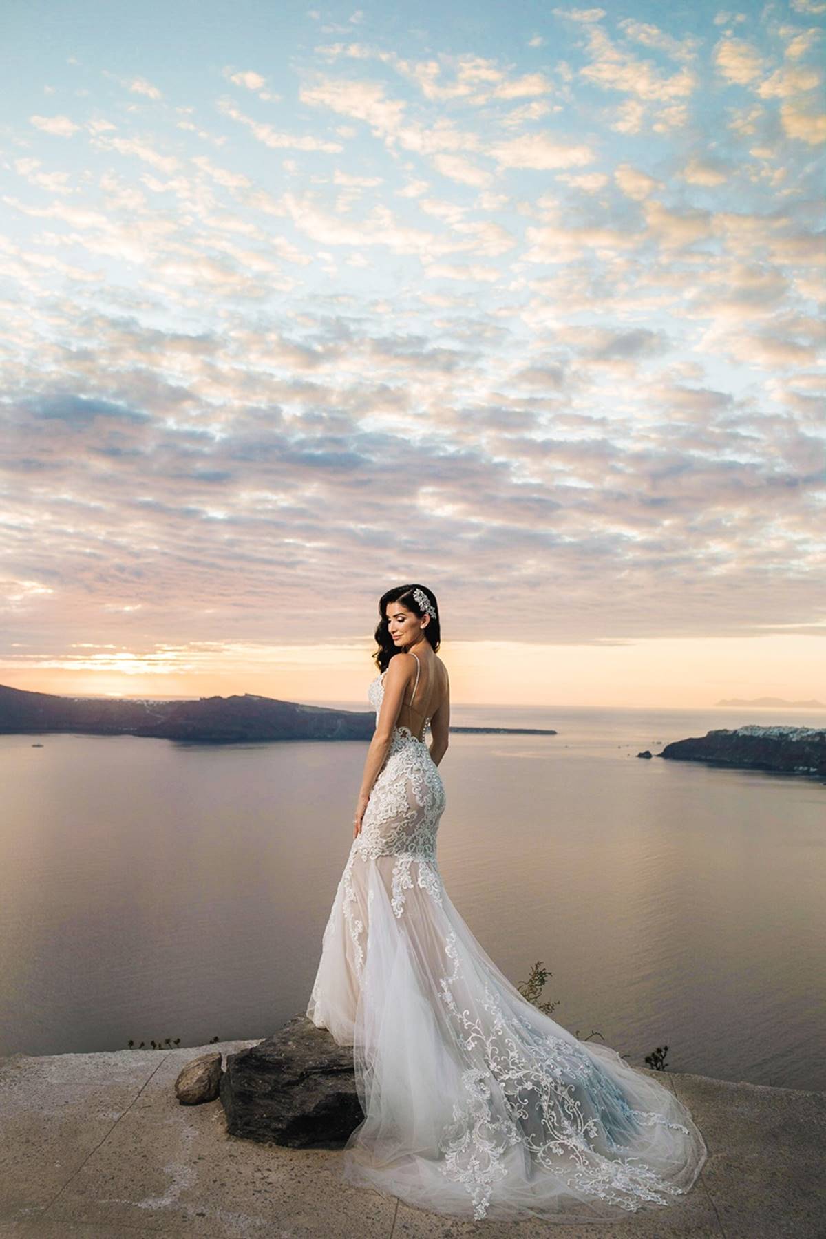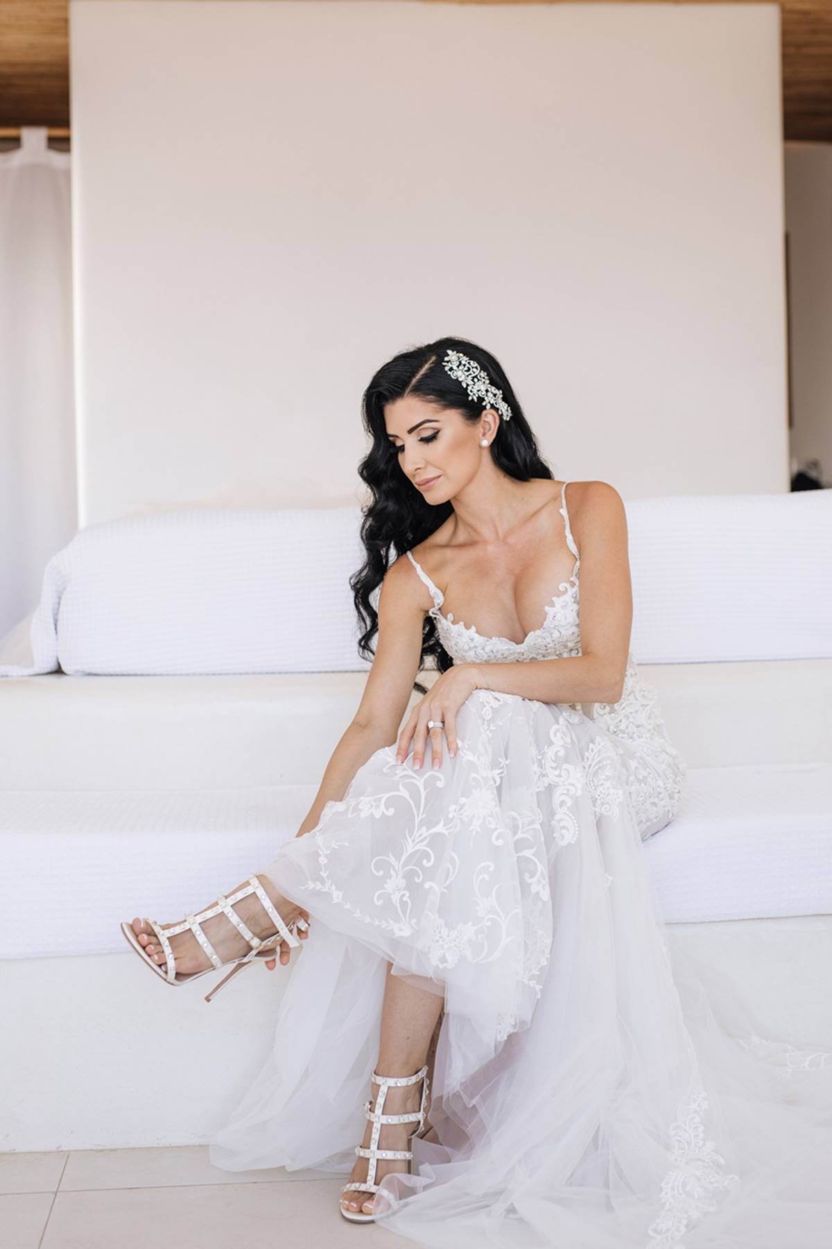 We were truly blessed with amazing weather on the day of the wedding and the light caught Britanny’s wedding dress details beautifully as the soft breeze grazed her hair. World renowned designer Nektaria, created a figure hugging dress, with see-through and lace details that complimented the beautiful bride in the best way. The “Botched” star was happy to wait for his bride for their romantic first look that was followed by a fun portrait session in the picturesque village of Imerovigli.