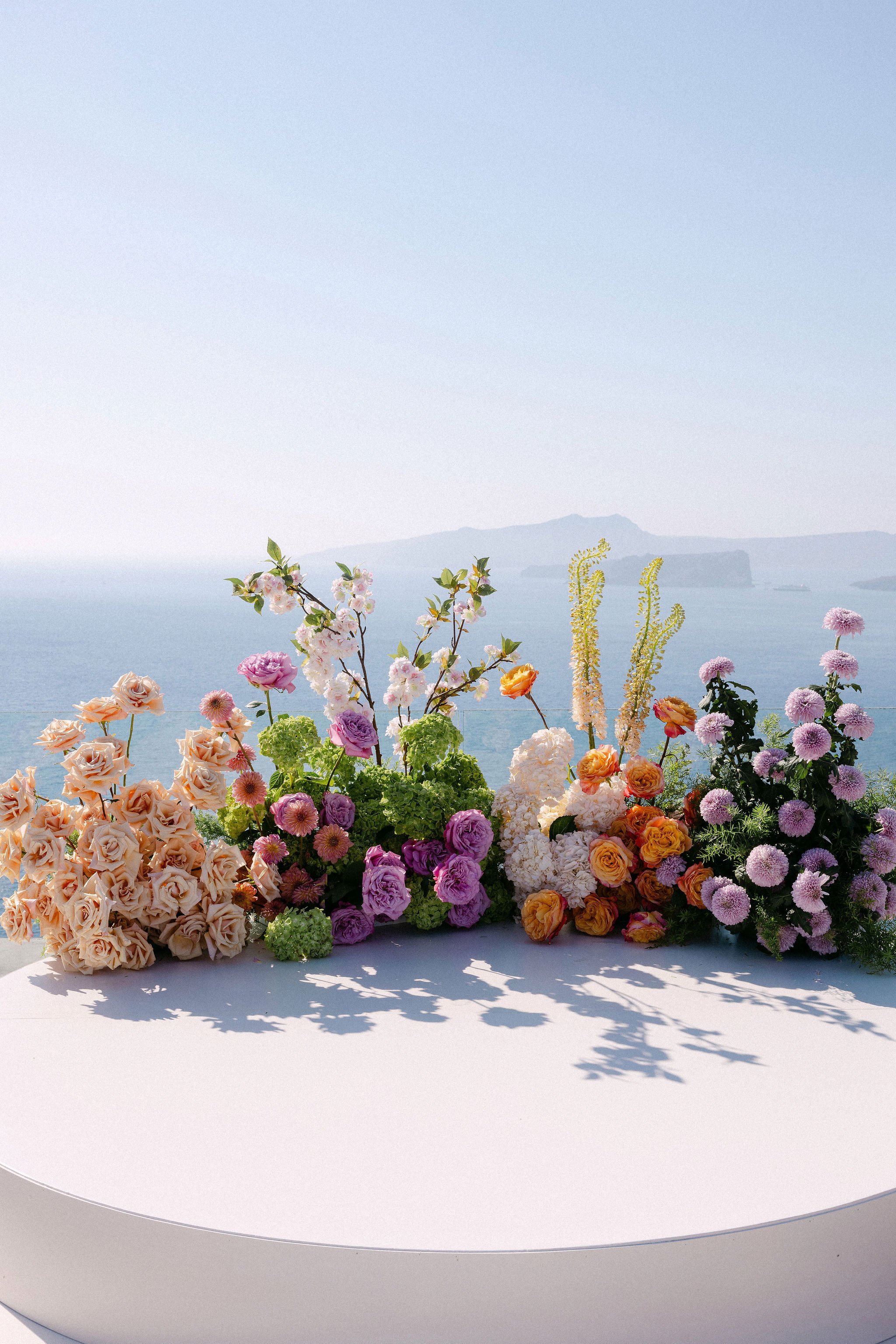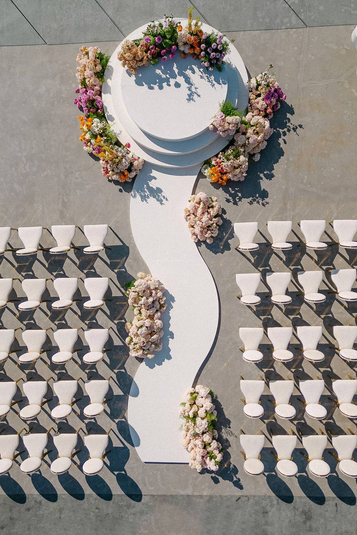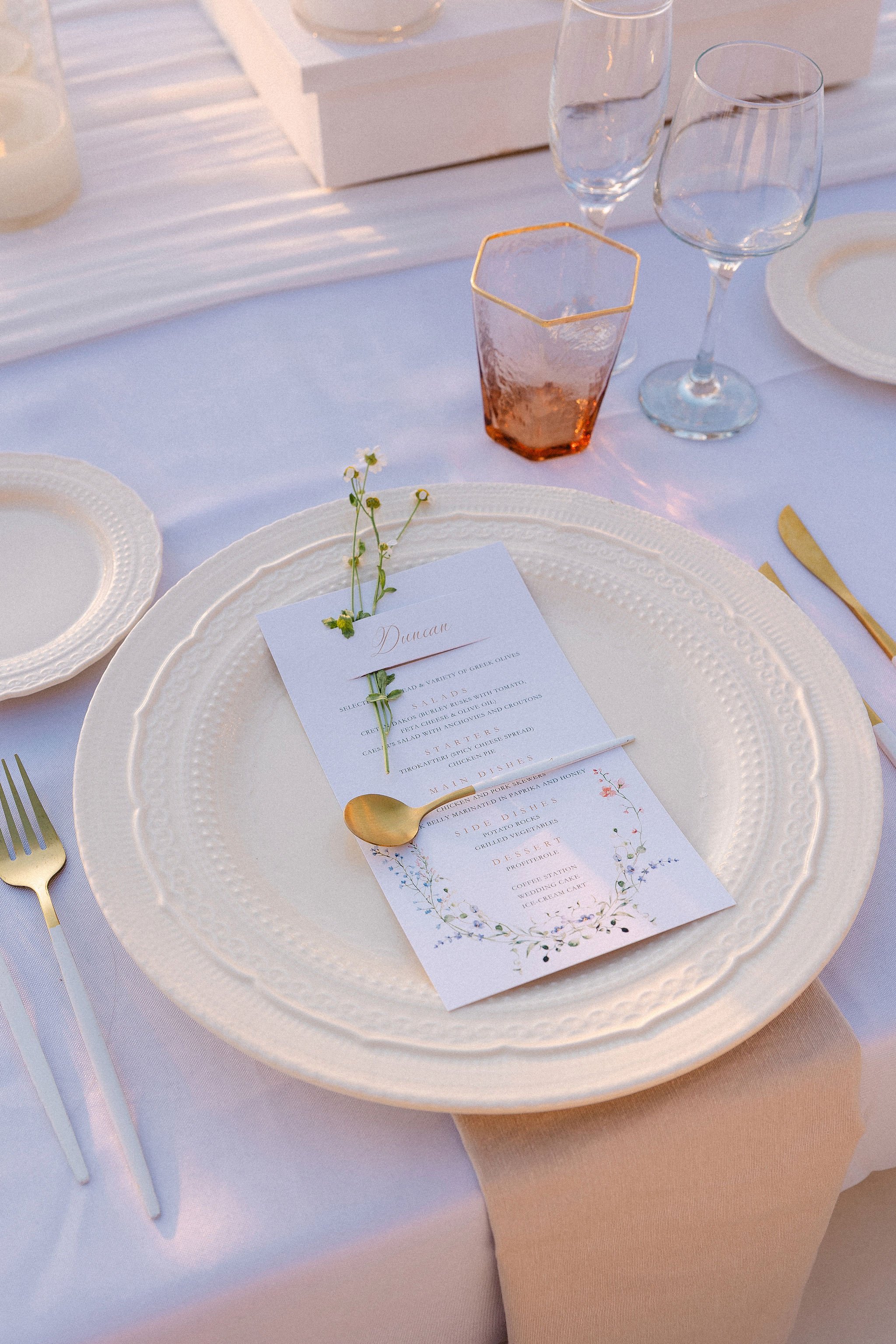 As their Greek wedding planner on the ground, we designed an event that reflected their story and vision while embracing the island’s romantic scenery. The ceremony featured a striking serpentine aisle surrounded by lush spring florals in pink, lilac, peach, and cream tones. Ivory and gold details added a touch of sophistication, as live piano and violin music accompanied the couple’s I Do’s.