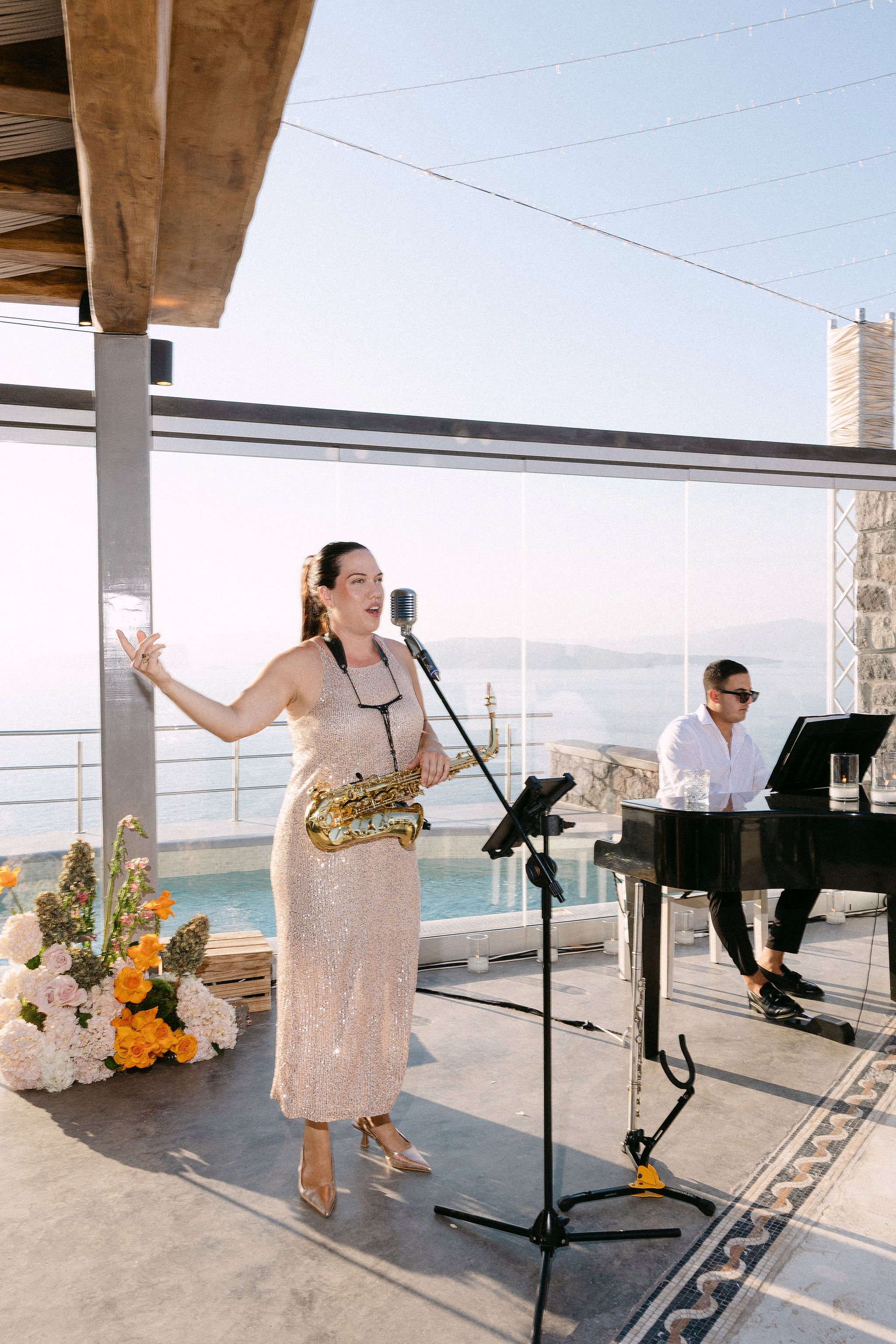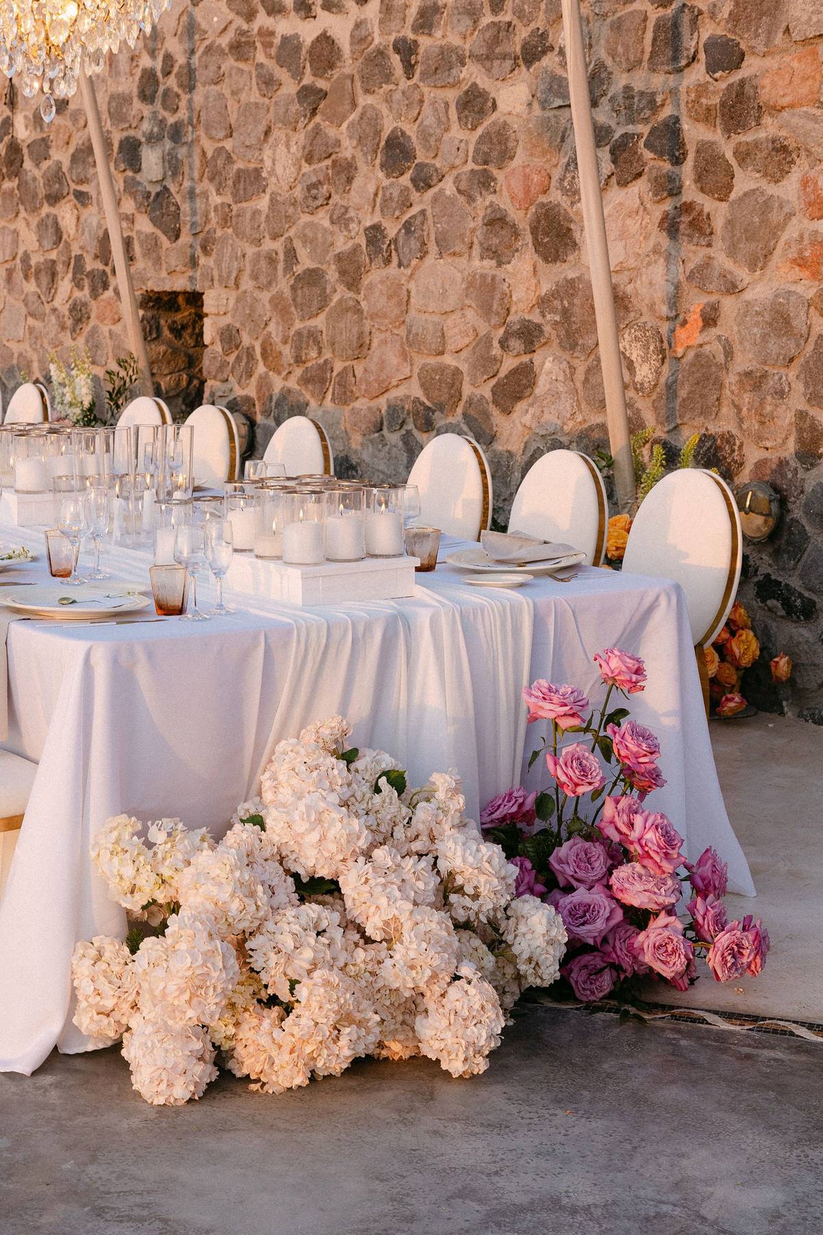 For the reception, guests gathered around an impressive long dinner table set under crystal chandeliers, overflowing florals, and hundreds of candles that created a warm, intimate glow — a signature design of timeless refinement. Live performances continued through the cocktail hour, with piano, saxophone, and vocals setting the tone for an evening of relaxed luxury.