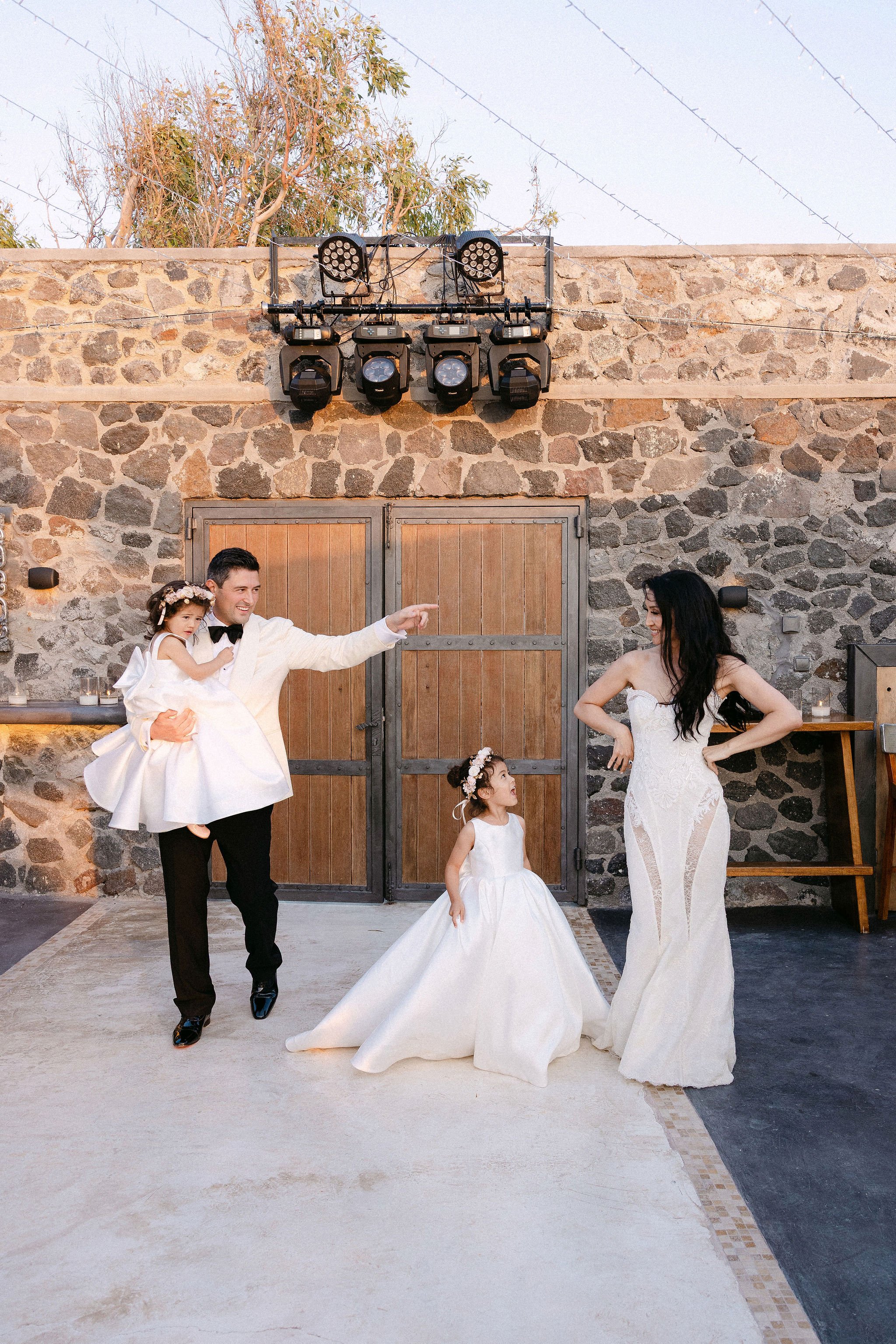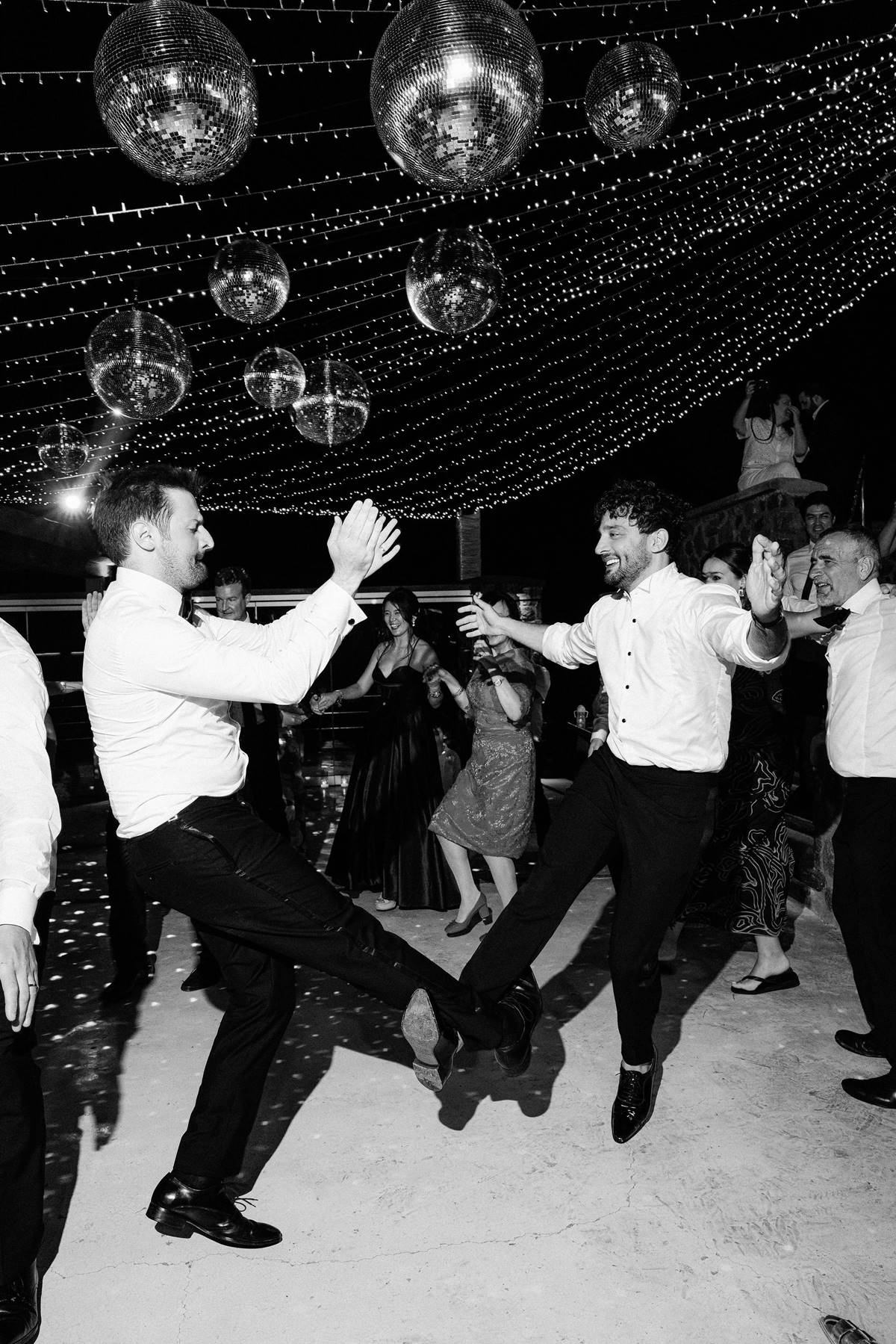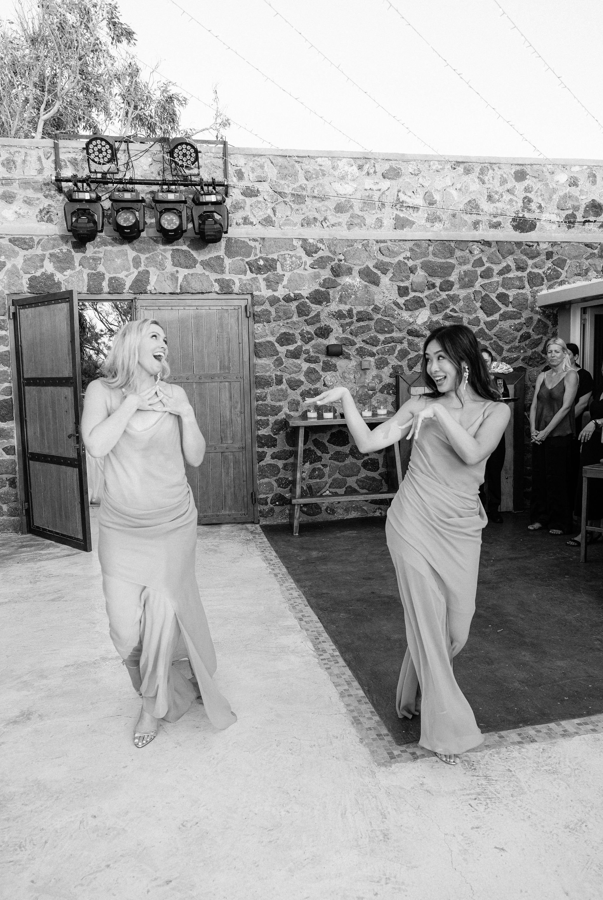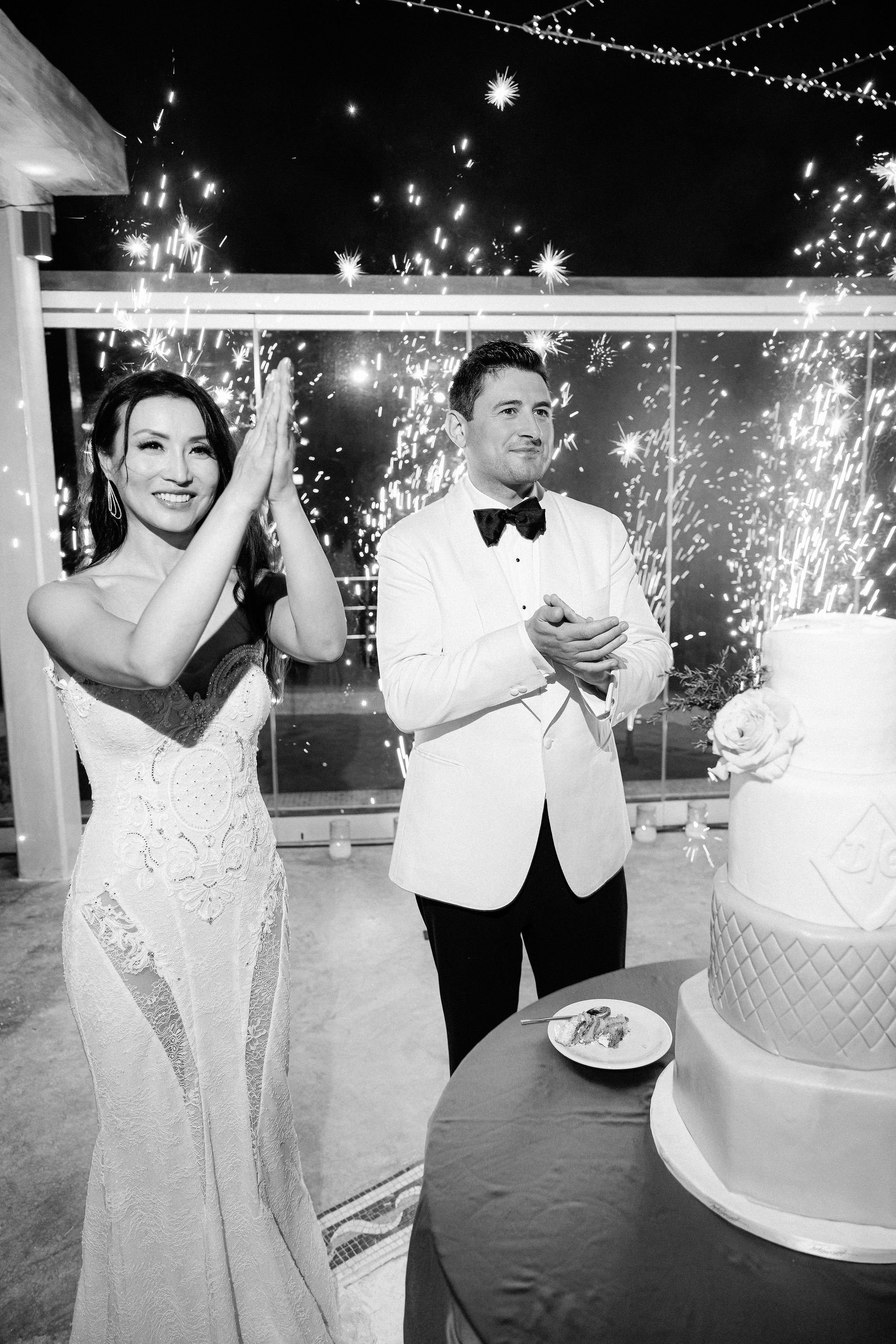 The couple decided on an impressive four-tier wedding cake engraved with their initials and Cavo Ventus, one of the Best Wedding Venues in Greece, evolved into a lively dance floor beneath twinkling string lights and shimmering disco balls. The party was complete with a band and professional Greek dancers invited everyone to join the sirtaki, creating an unforgettable cultural moment that captured the essence of a Destination Wedding in Greece.