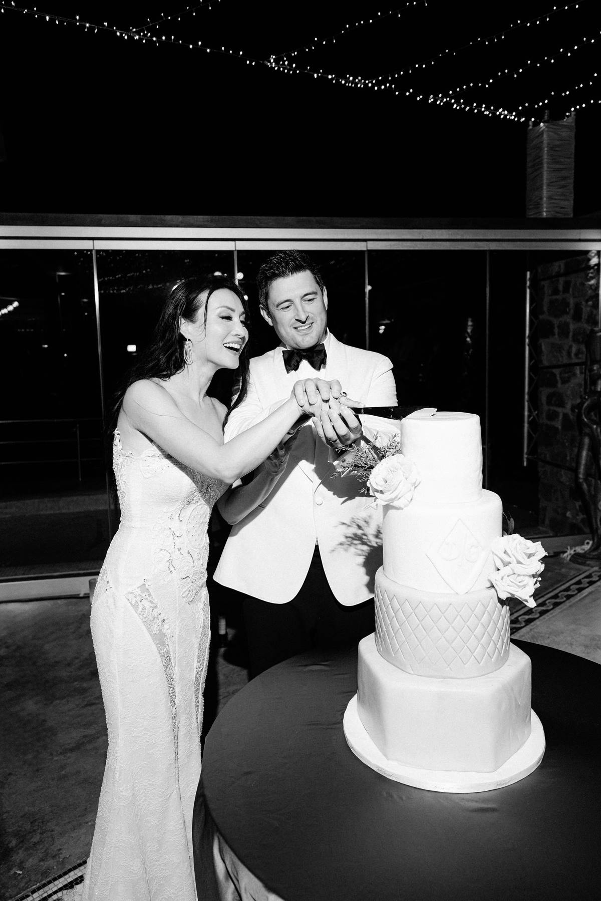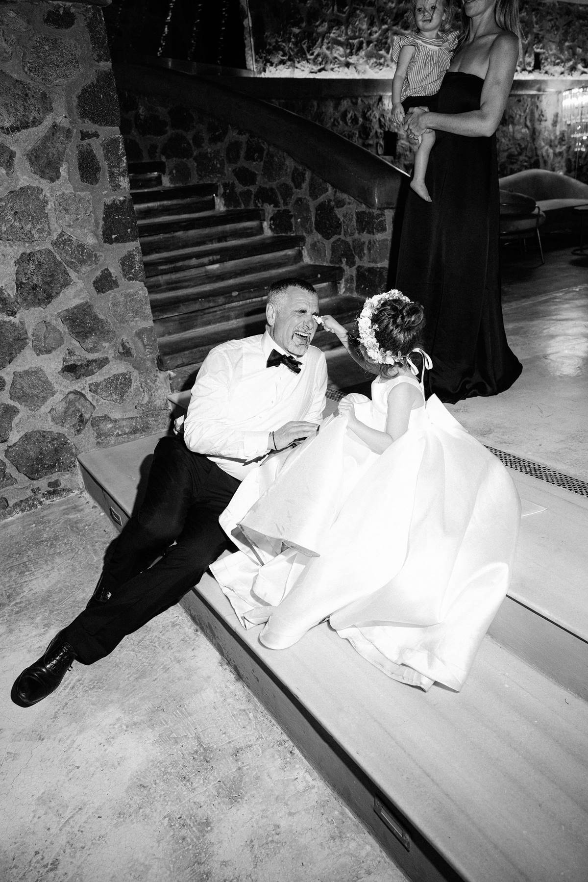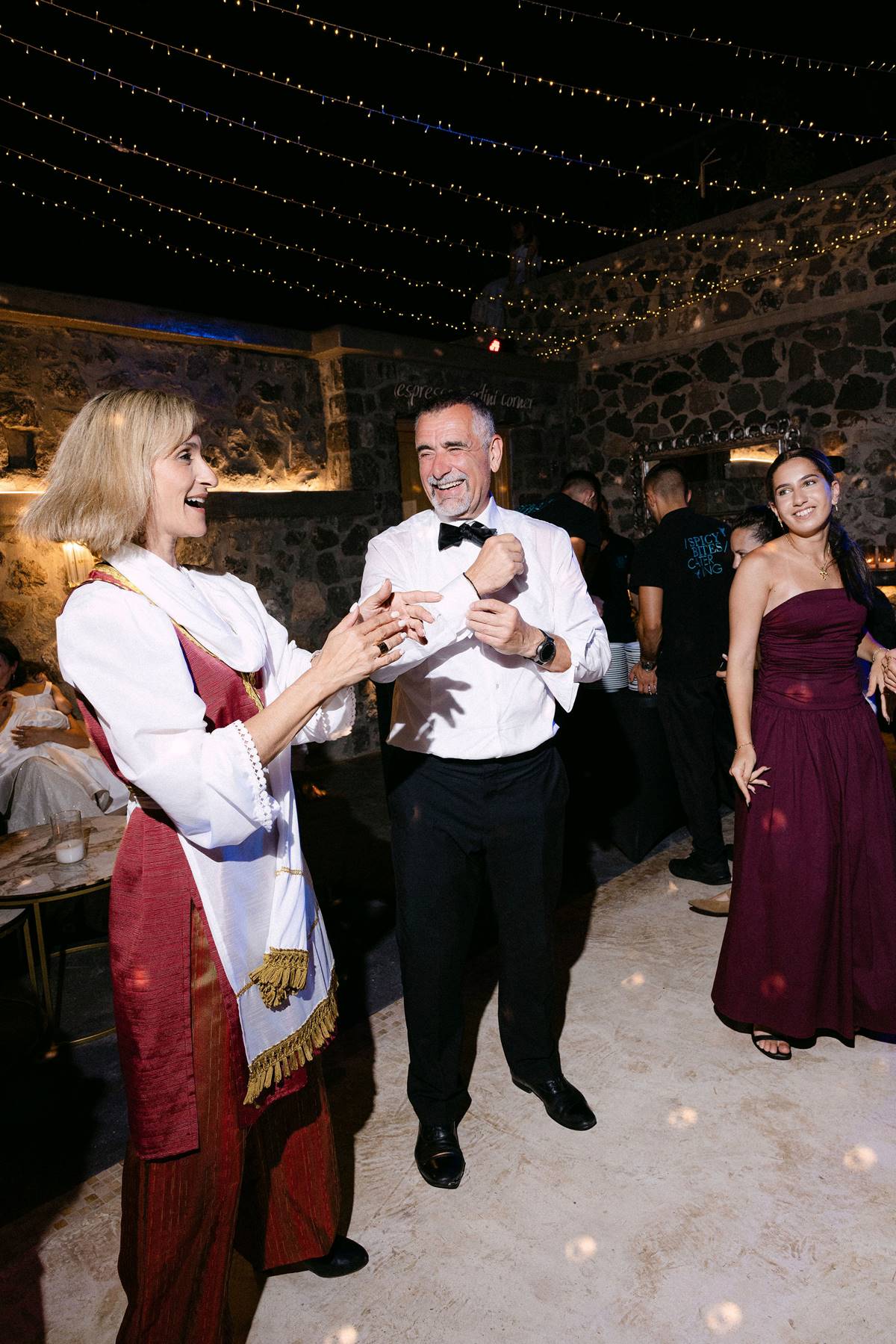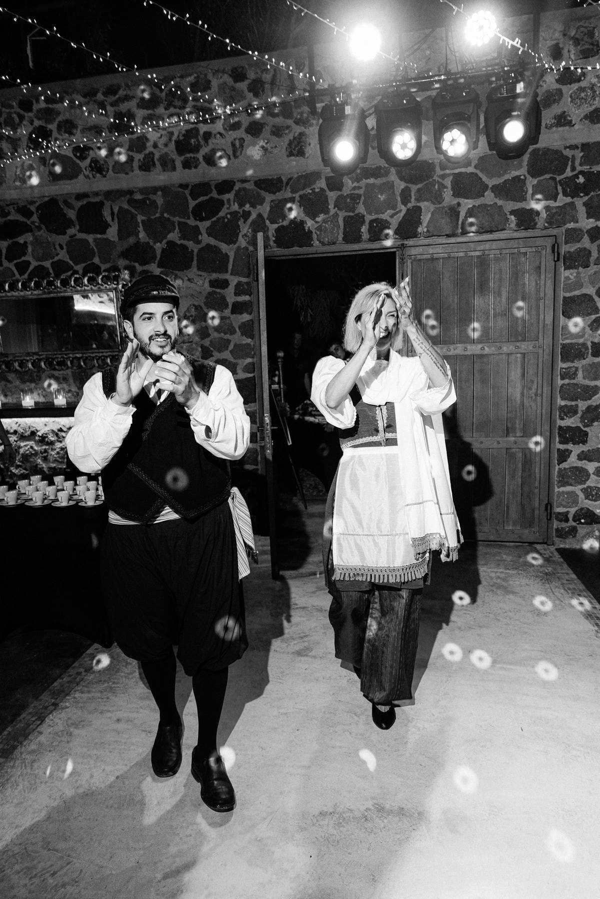 The couple decided on an impressive four-tier wedding cake engraved with their initials and Cavo Ventus, one of the Best Wedding Venues in Greece, evolved into a lively dance floor beneath twinkling string lights and shimmering disco balls. The party was complete with a band and professional Greek dancers invited everyone to join the sirtaki, creating an unforgettable cultural moment that captured the essence of a Destination Wedding in Greece.