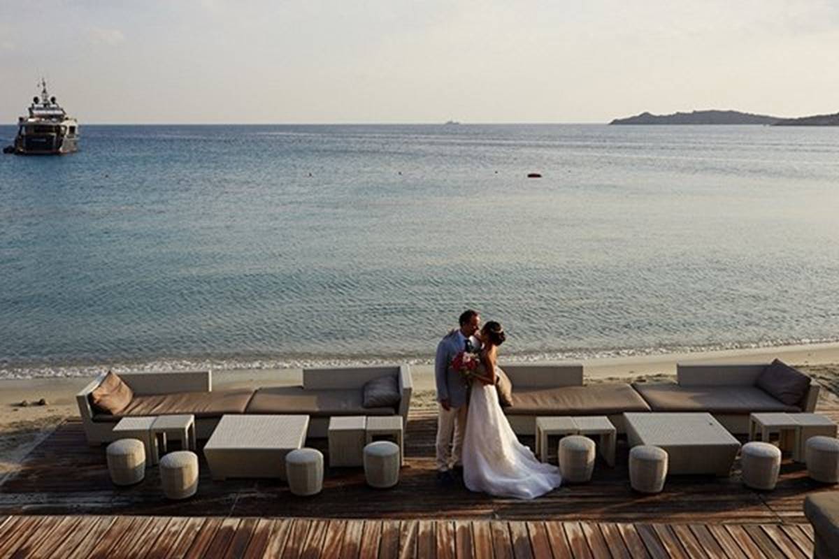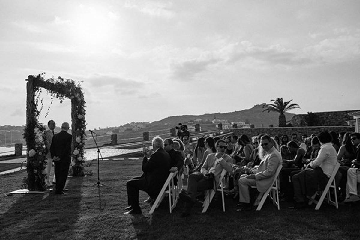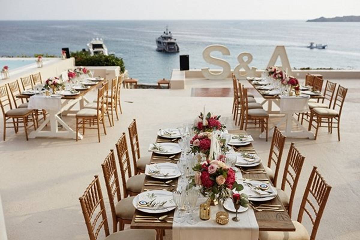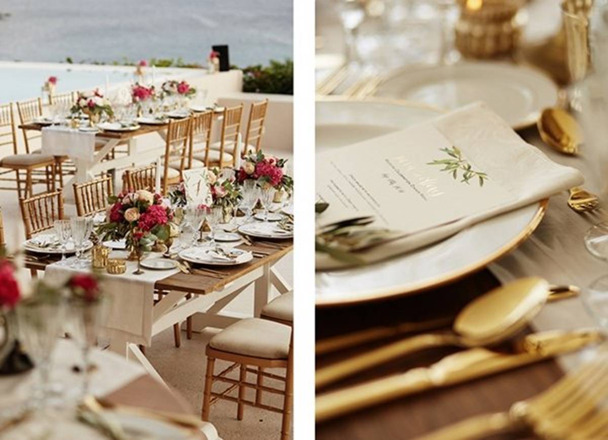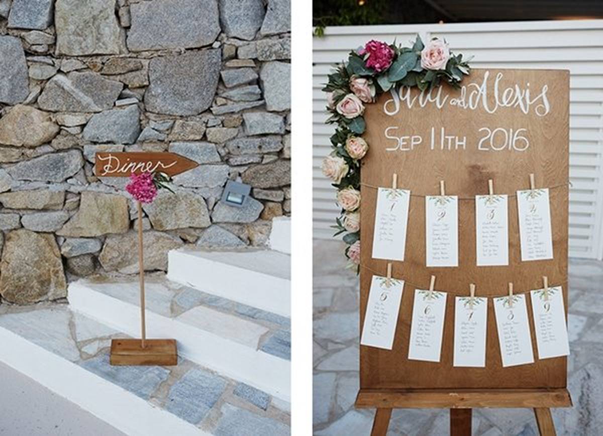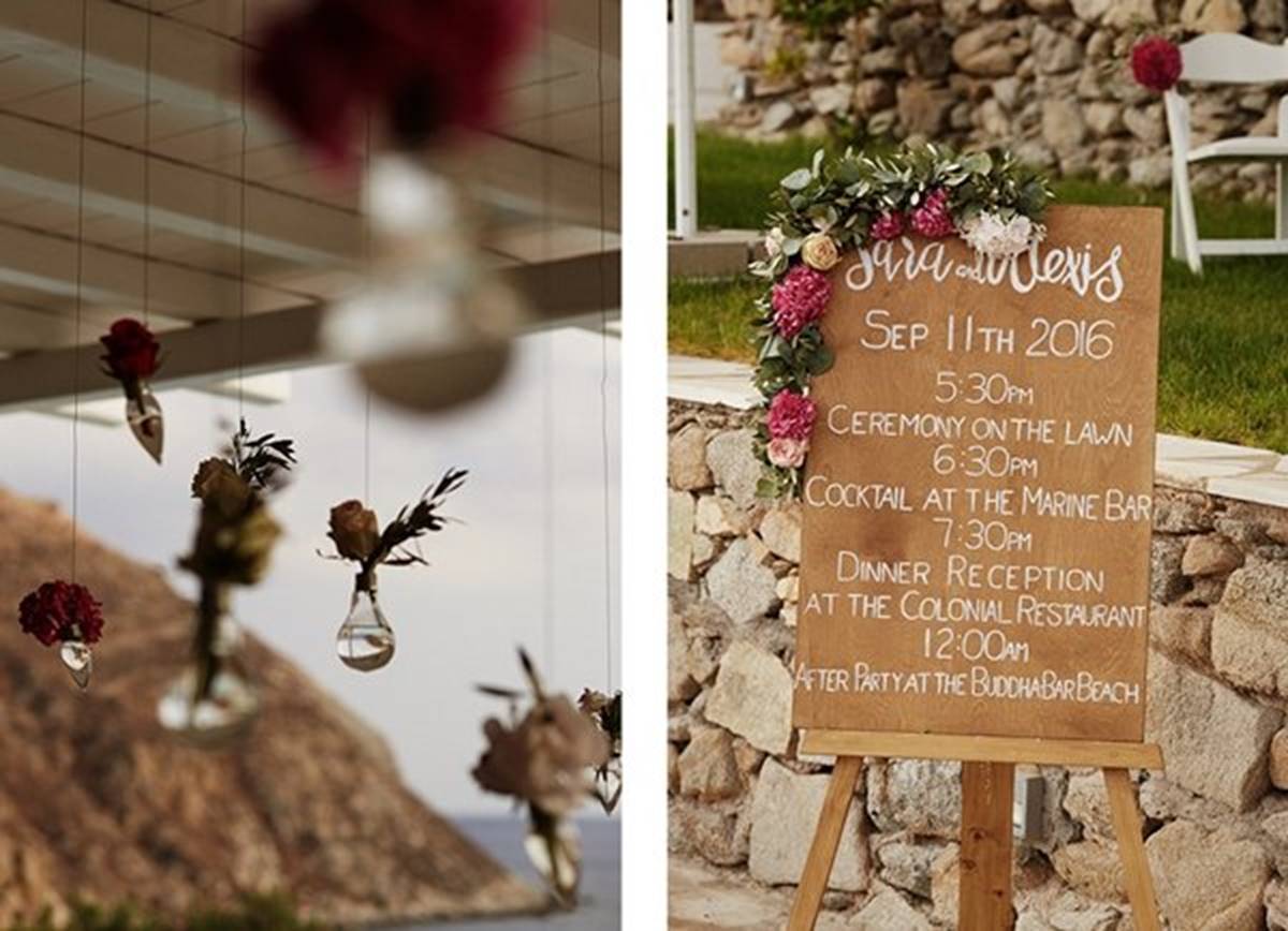 Sara and Alexis’ chic and elegant Mykonos wedding has it all – gorgeous styling, romance, fun, lot’s of Greek dancing and the unforgettable backdrop of one of the most beautiful islands in the world. The bright coloured flowers on the ceremony arch and the reception tables, all wonderfully arranged by Secret Garden, were the feature that really popped out against the blue colours of the Aegean sea and at the same time filled the open spaces of the Santa Marina Resort in Ornos bay. Weddings and Whimsy completed the styling with a luxurious flare, creating custom-made wooden signs, a photo booth, a programme and table plan, for that personalised touch that always makes a difference.