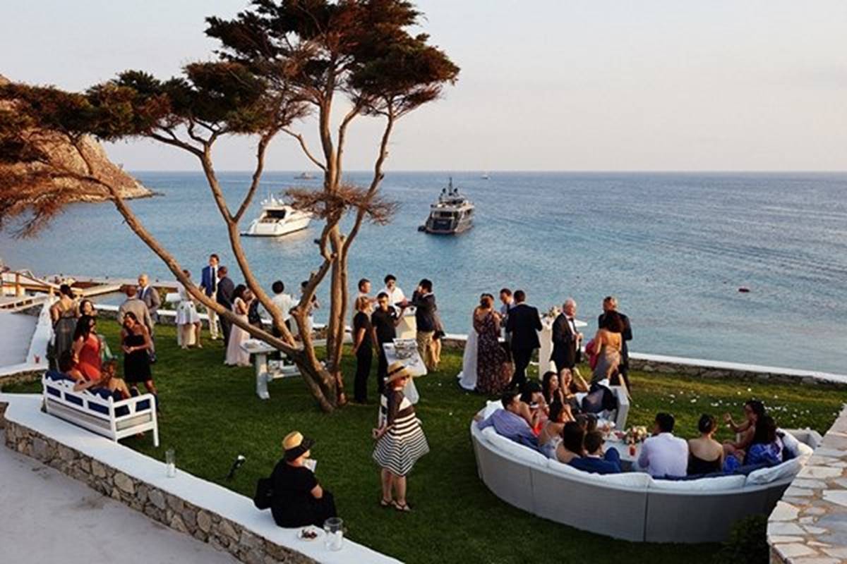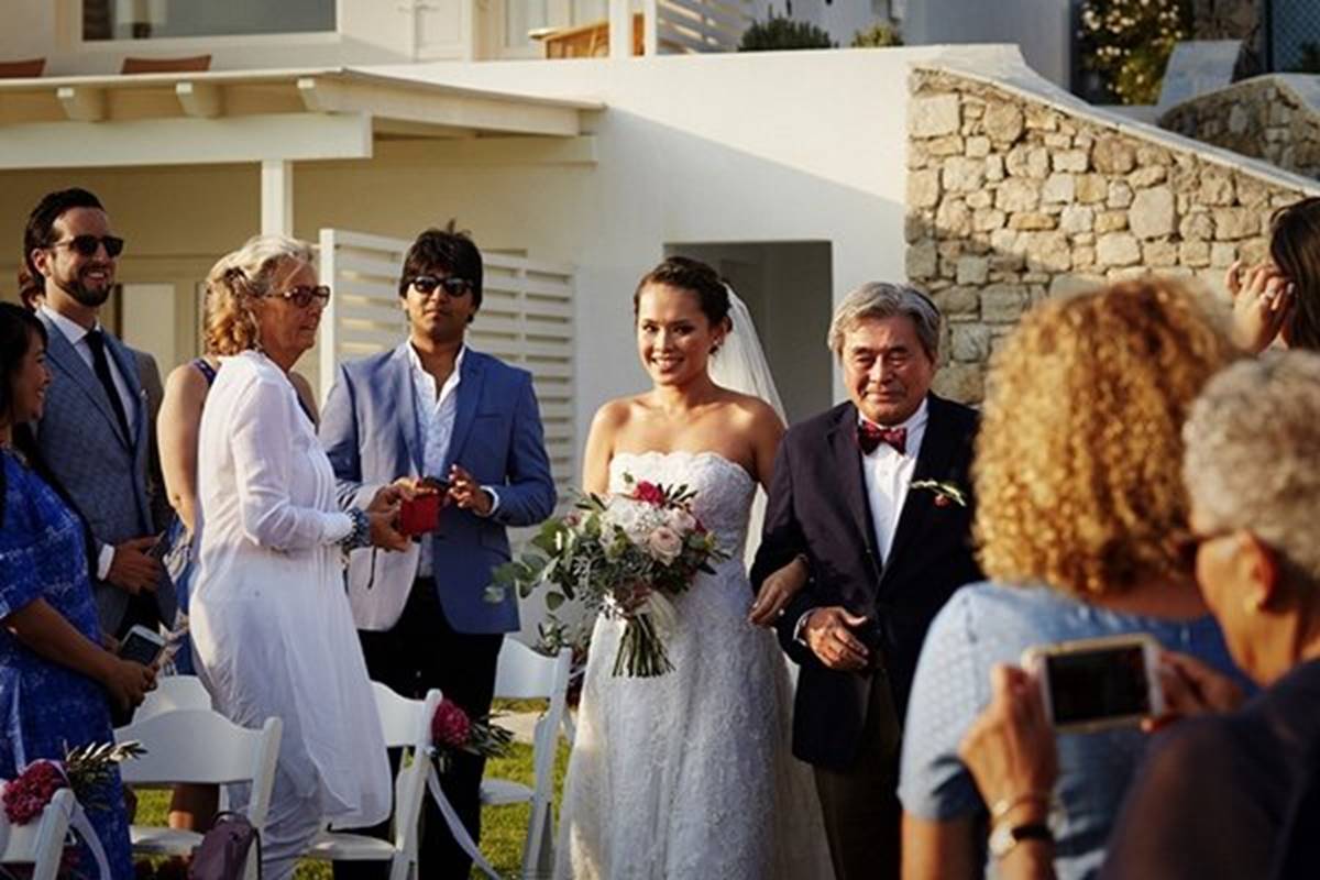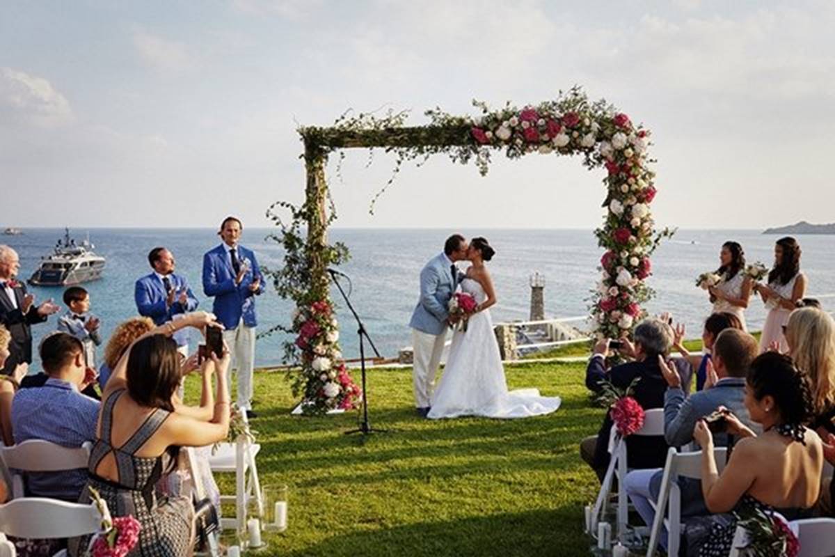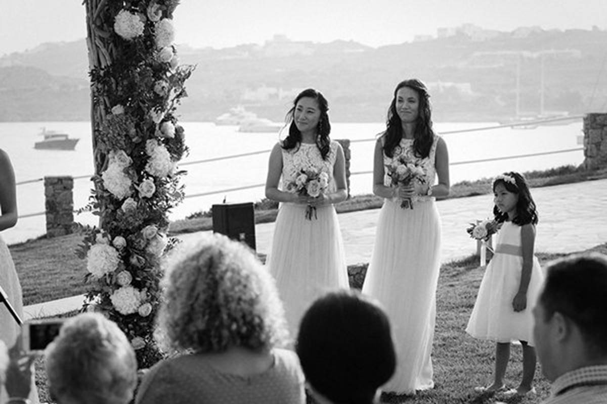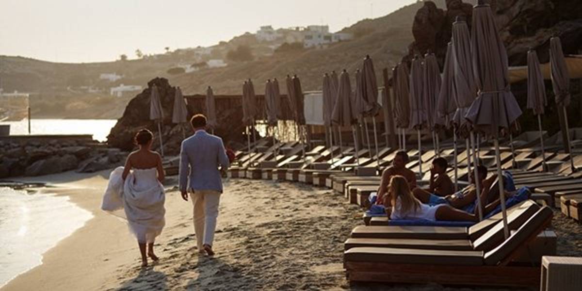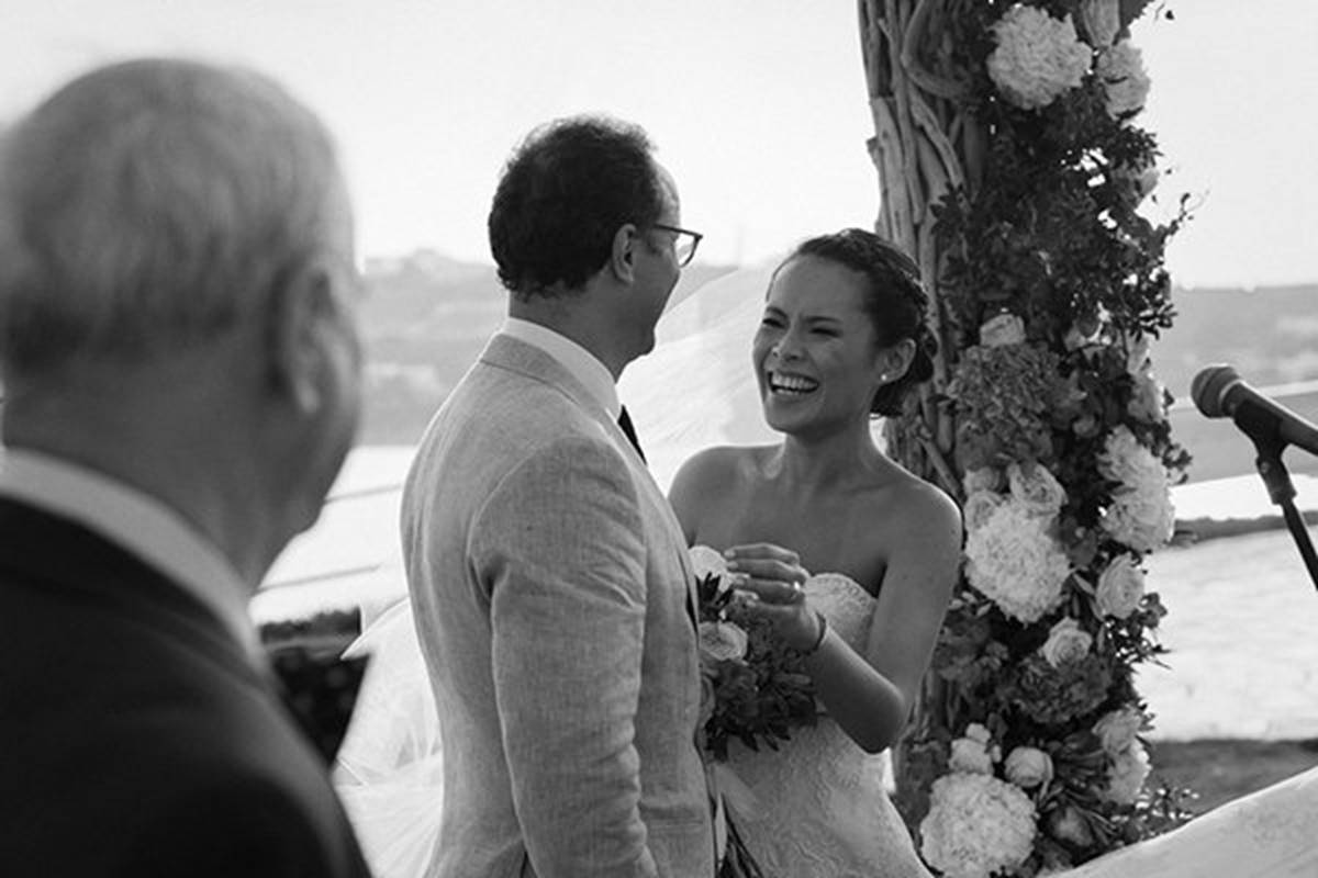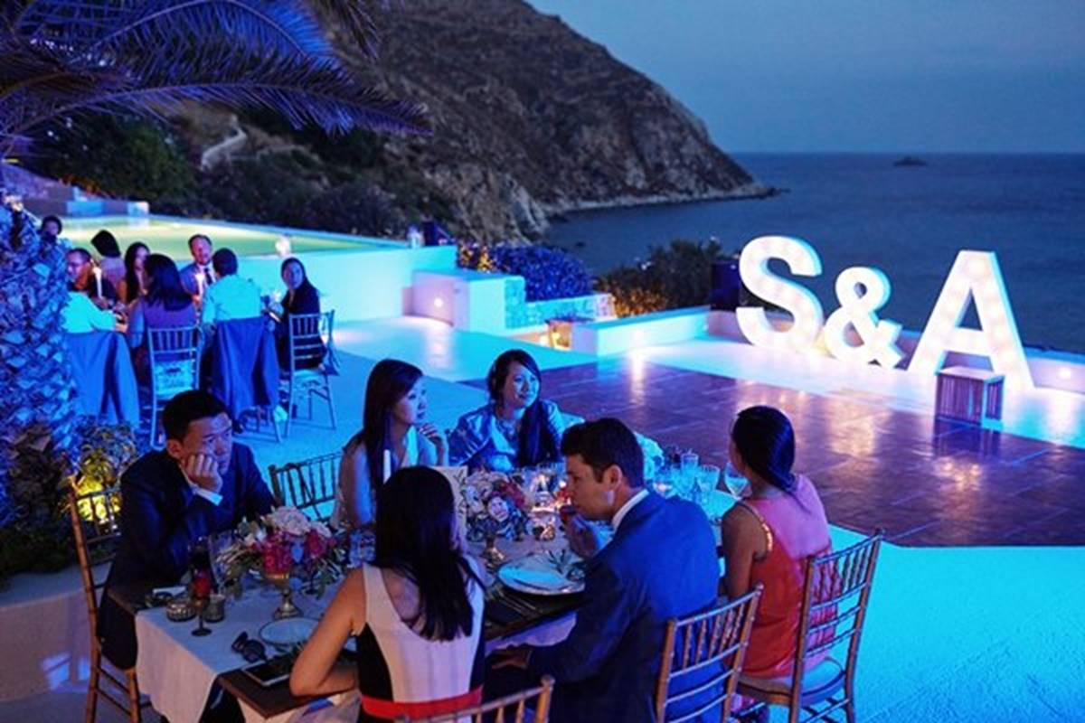 Sara and Alexis’ chic and elegant Mykonos wedding has it all – gorgeous styling, romance, fun, lot’s of Greek dancing and the unforgettable backdrop of one of the most beautiful islands in the world. The bright coloured flowers on the ceremony arch and the reception tables, all wonderfully arranged by Secret Garden, were the feature that really popped out against the blue colours of the Aegean sea and at the same time filled the open spaces of the Santa Marina Resort in Ornos bay. Weddings and Whimsy completed the styling with a luxurious flare, creating custom-made wooden signs, a photo booth, a programme and table plan, for that personalised touch that always makes a difference.