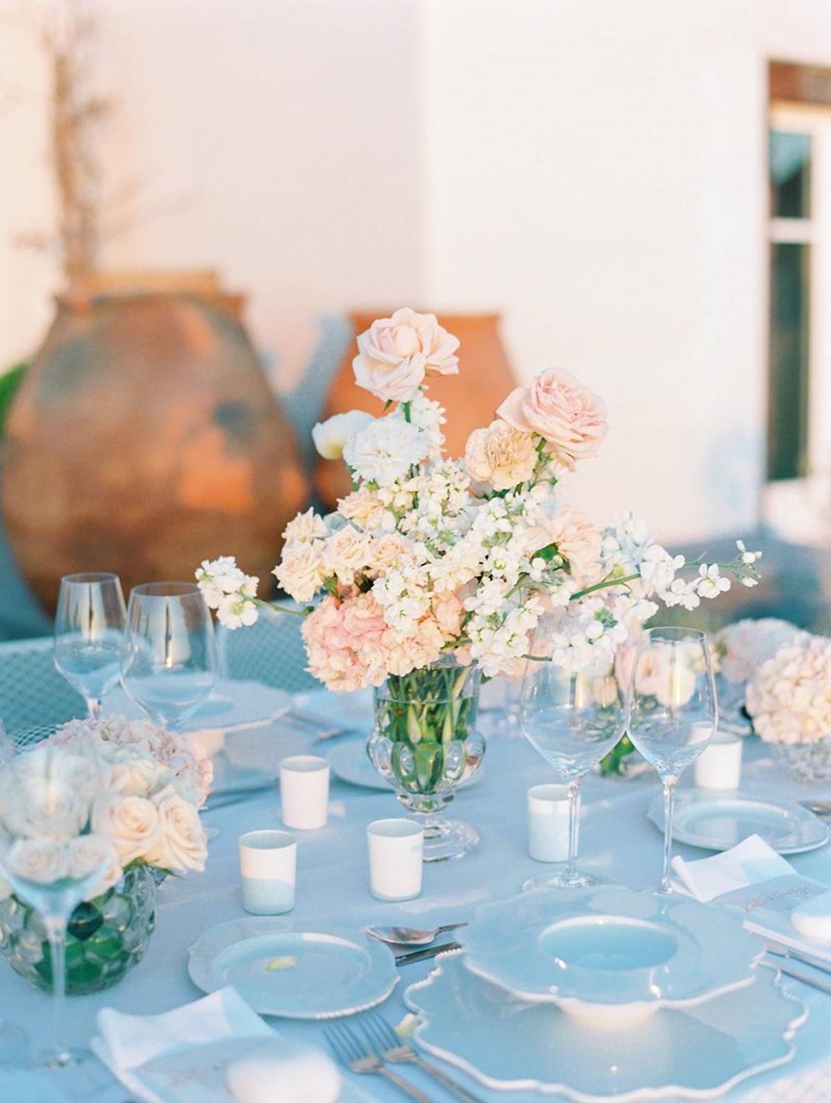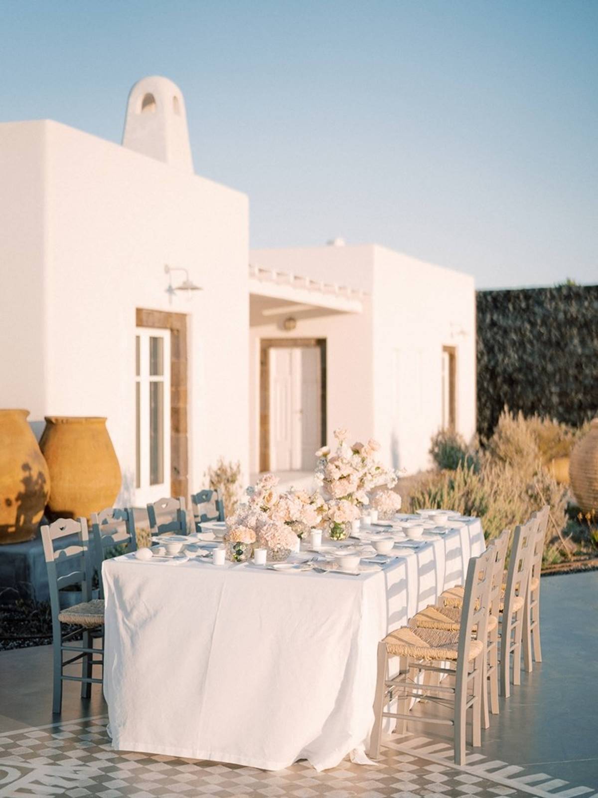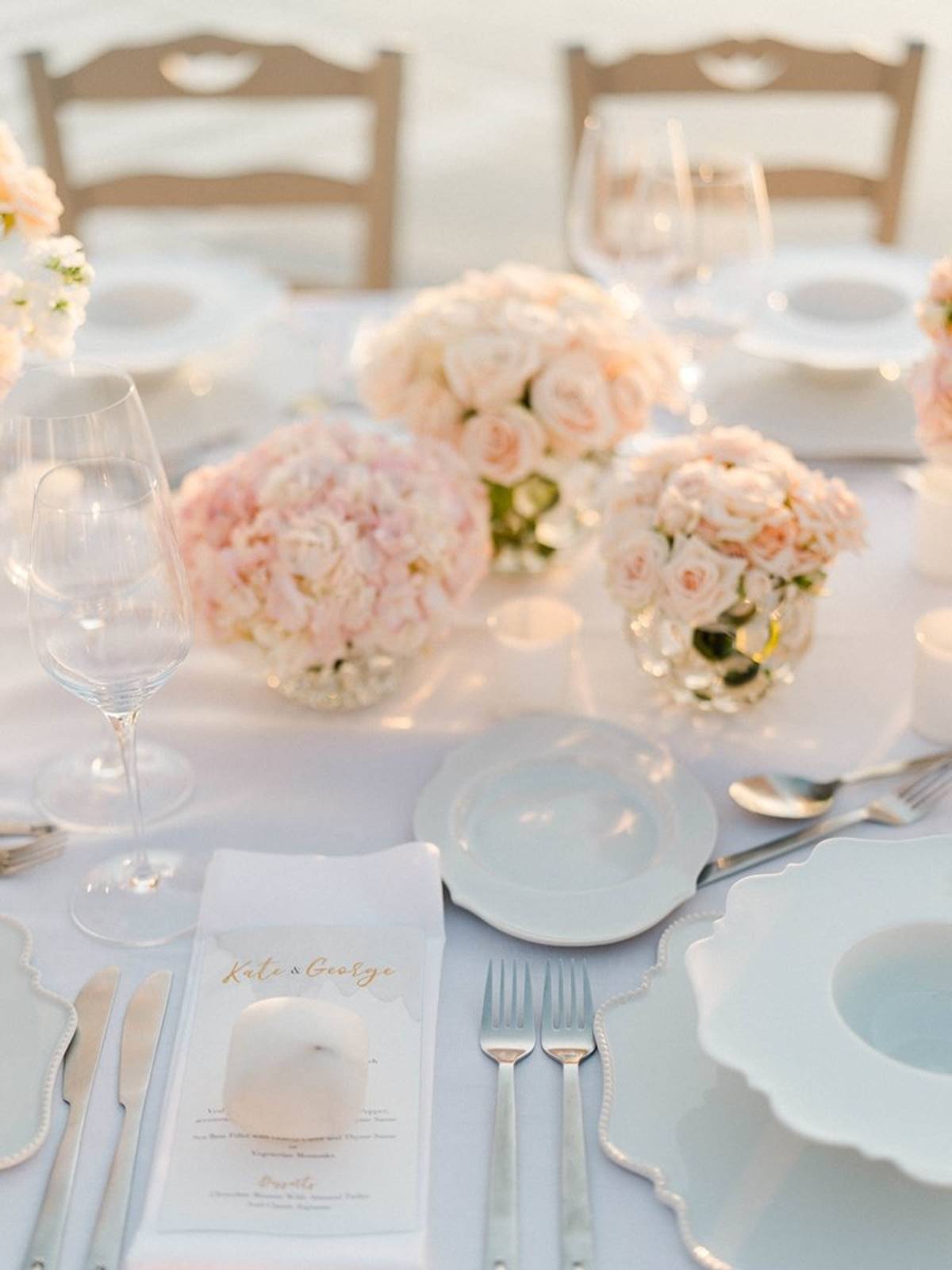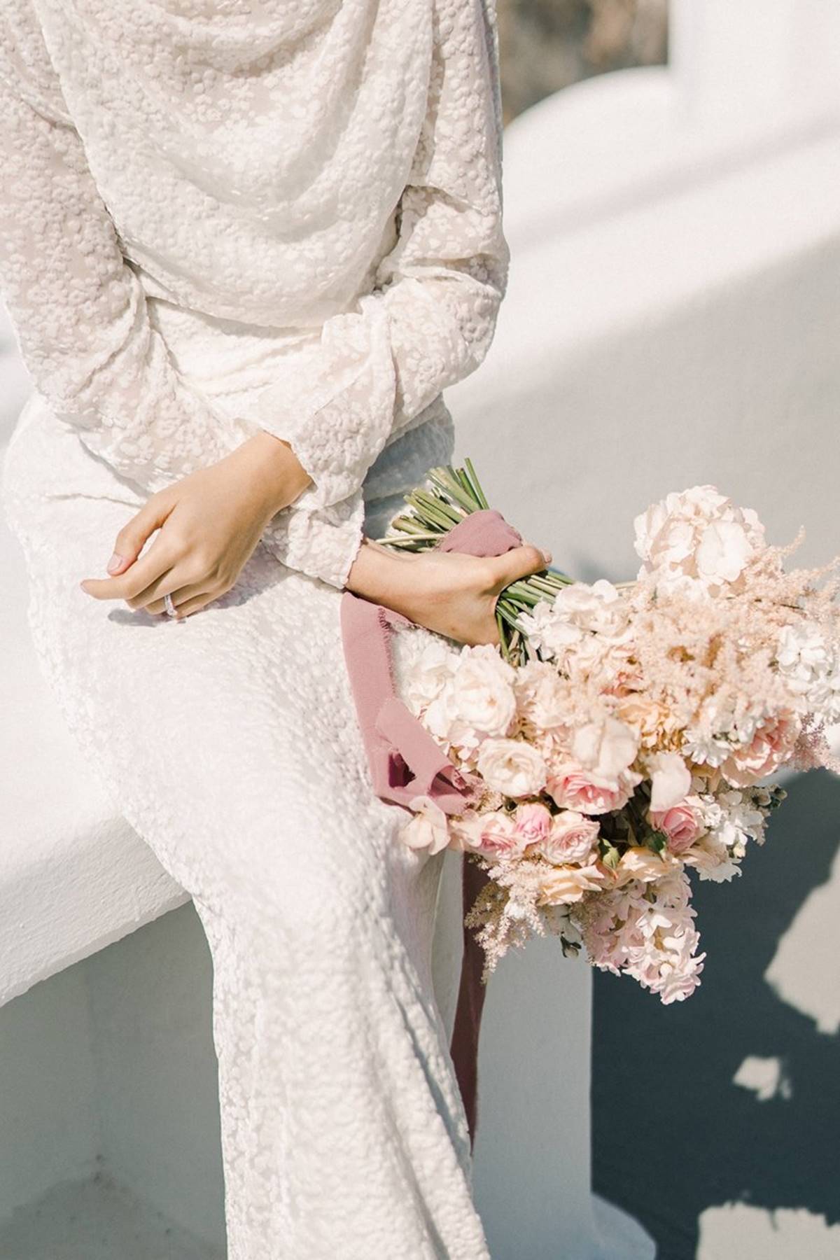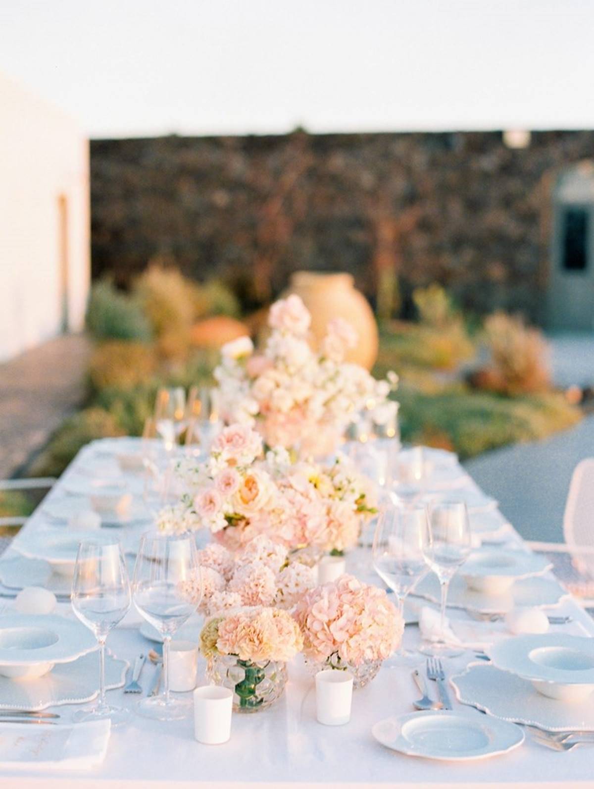 When in Santorini one only needs to find way to complement the surroundings and give the day a sense of festivity without exaggerations. A wonderful canvas like the Aegean sea allows for high-end lavishness with flower arrangements full of sweet peas, carnations, garden and spray roses as well as violets in a pastel palette of blush, peach and ivory tones.